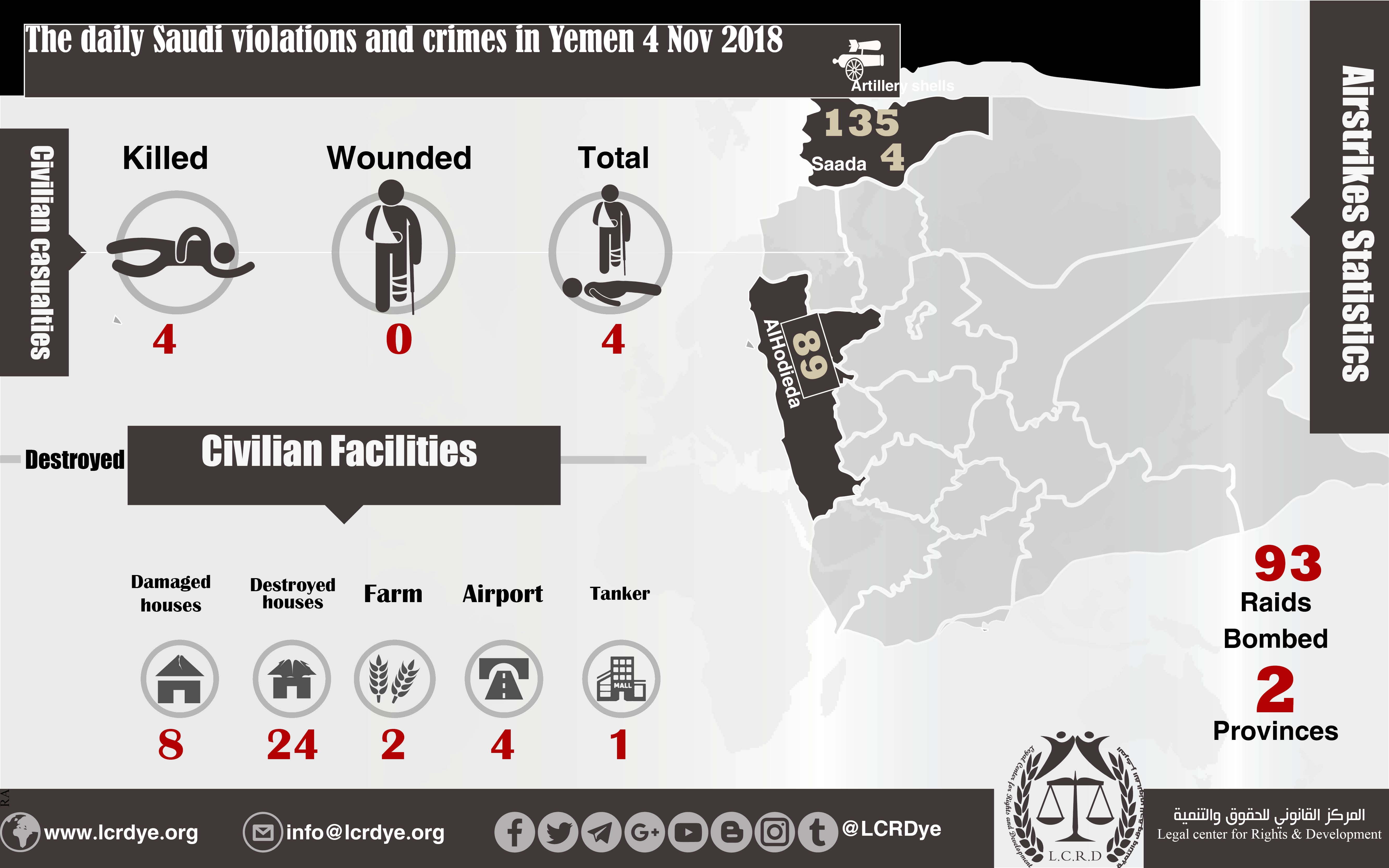 DAILY VIOLATION OBSERVATION REPORTS The daily report of the Saudi violations and crimes in Yemen 4 Nov 2018 Share For download: legal center for right and developmentSaudi coalition CrimesViolation war lawsYemen Share FacebookTwitterGoogle+ReddItWhatsAppPinterestEmail