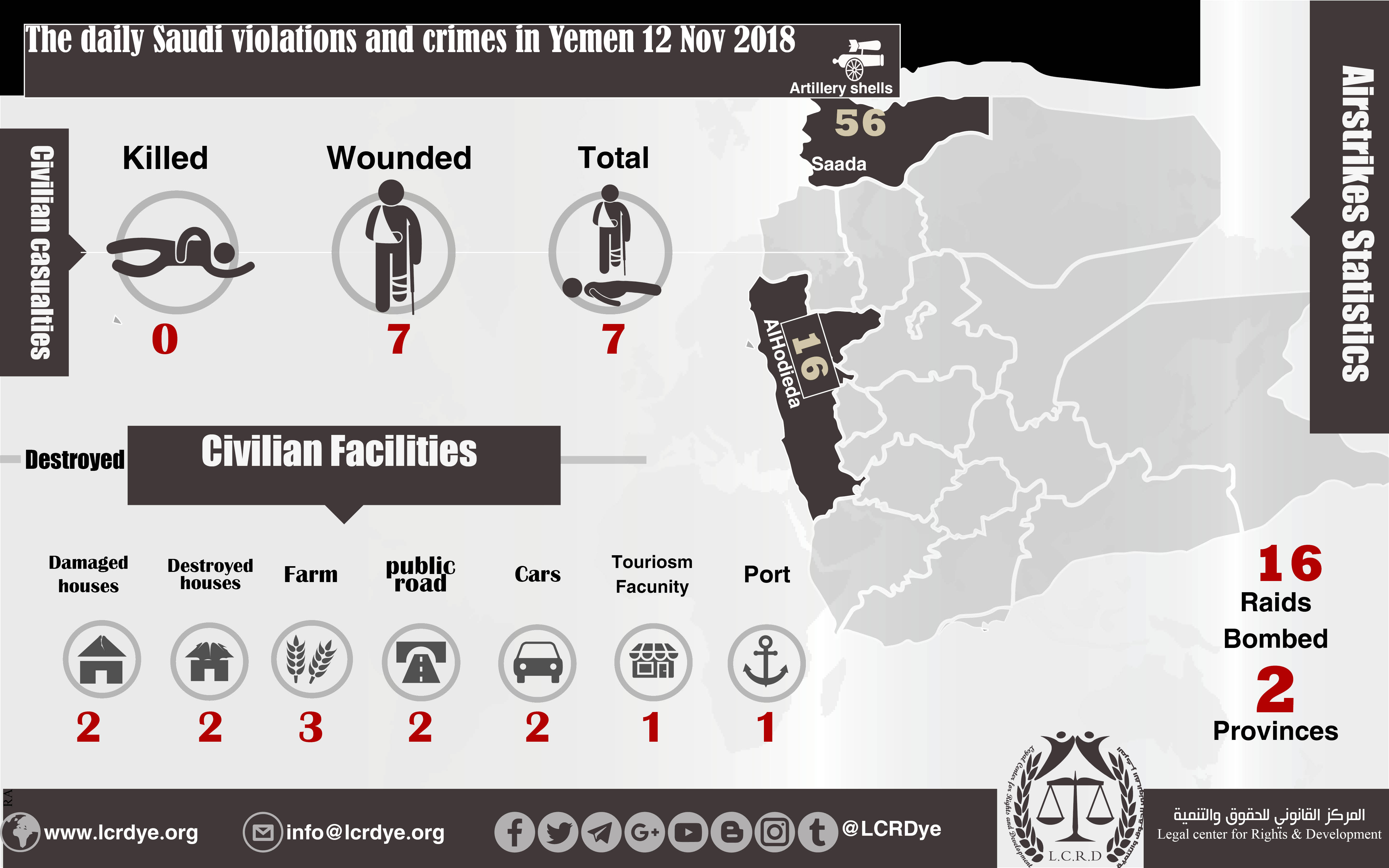 DAILY VIOLATION OBSERVATION REPORTS The daily report of the Saudi violations and crimes in Yemen 11 Nov 2018 Share For download: legal center for right and developmentSaudi coalition CrimesViolation war lawsYemen Share FacebookTwitterGoogle+ReddItWhatsAppPinterestEmail