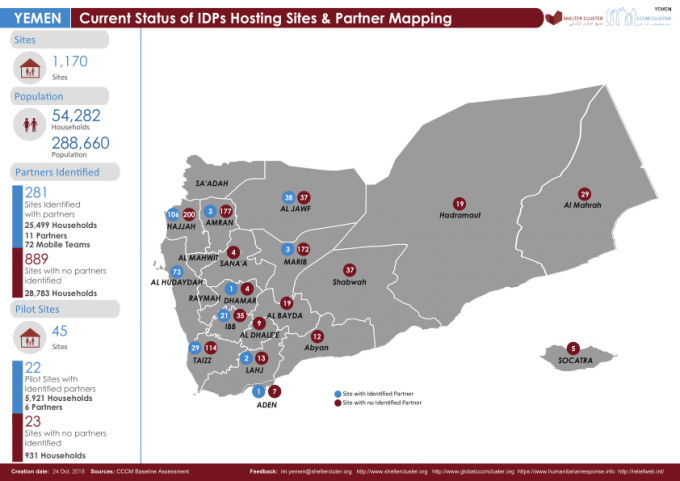 Yemen: Current Status of IDPs Hosting Sites & Partner Mapping (as of 24 October 2018) Share https://reliefweb.int/report/yemen/yemen-current-status-idps-hosting-sites-partner-mapping-24-october-2018 International Info-graphicYemen: Current Status of IDPs Hosting Sites & Partner Mapping (as of 24 October 2018) Share FacebookTwitterGoogle+ReddItWhatsAppPinterestEmail