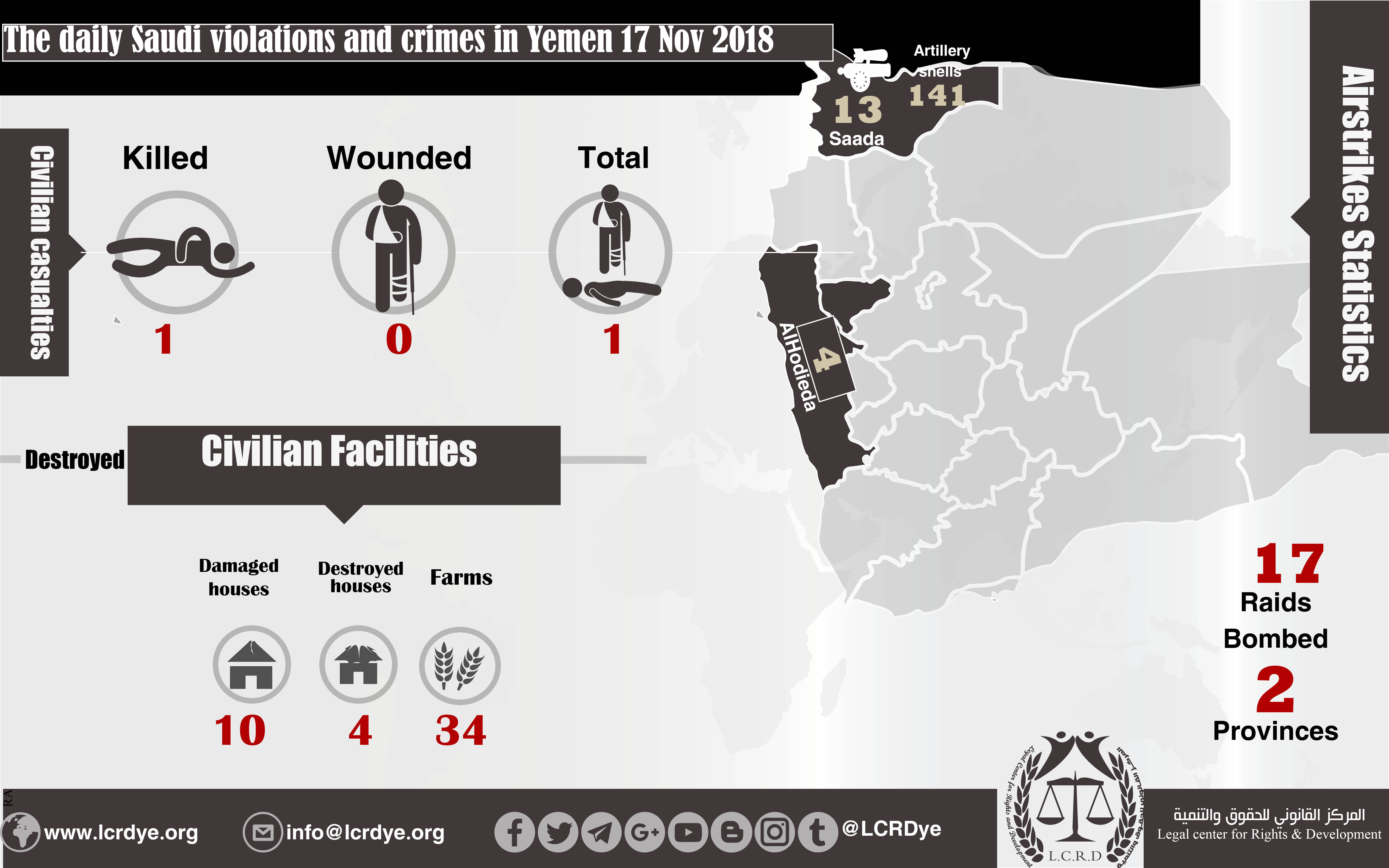 DAILY VIOLATION OBSERVATION REPORTS The daily report of the Saudi violations and crimes in Yemen 17 Nov 2018 Share For download: legal center for right and developmentSaudi coalition CrimesViolation war lawsYemen Share FacebookTwitterGoogle+ReddItWhatsAppPinterestEmail