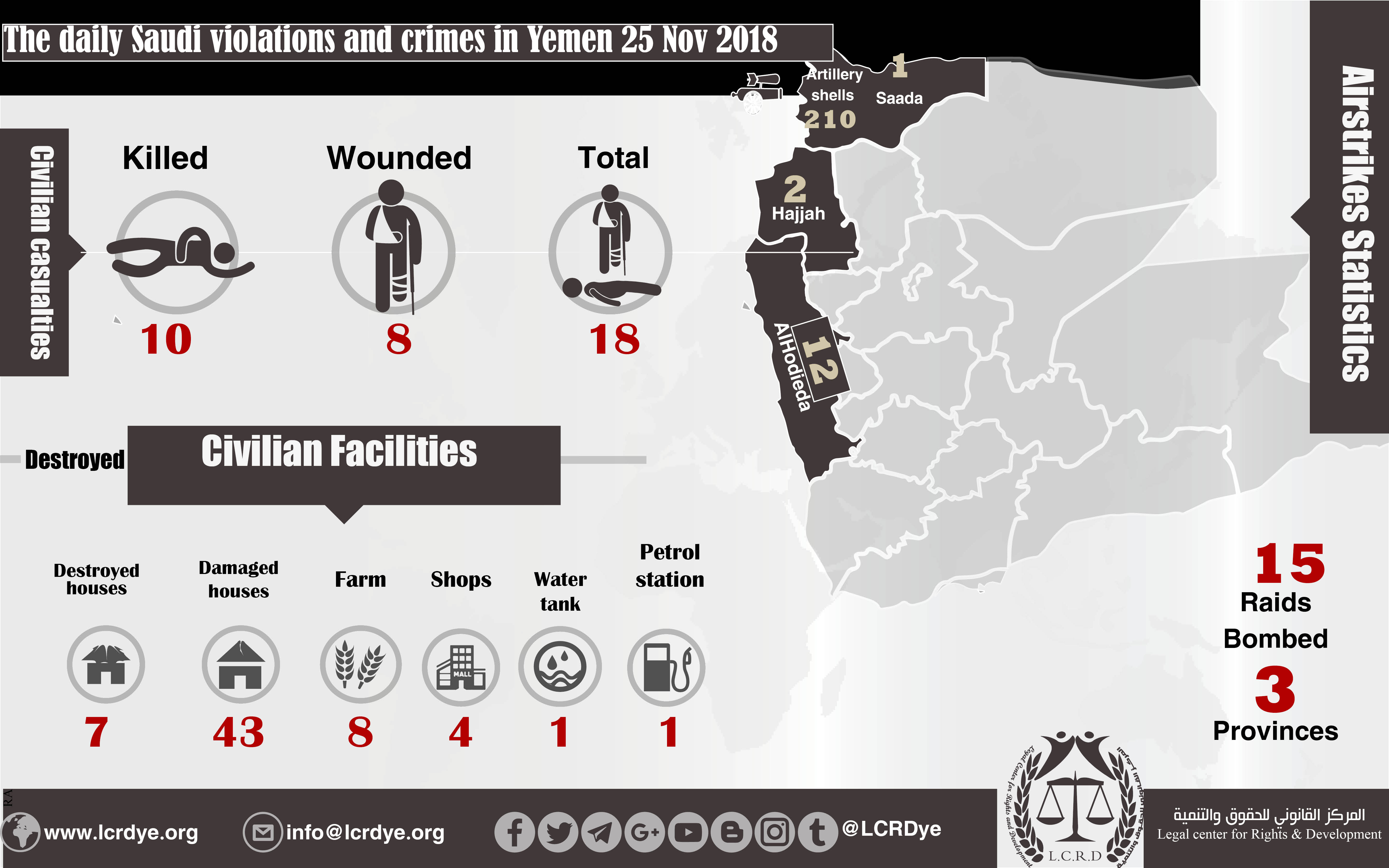 DAILY VIOLATION OBSERVATION REPORTS The daily report of the Saudi violations and crimes in Yemen 25 Nov 2018 Share For download: legal center for right and developmentSaudi coalition CrimesViolation war lawsYemen Share FacebookTwitterGoogle+ReddItWhatsAppPinterestEmail