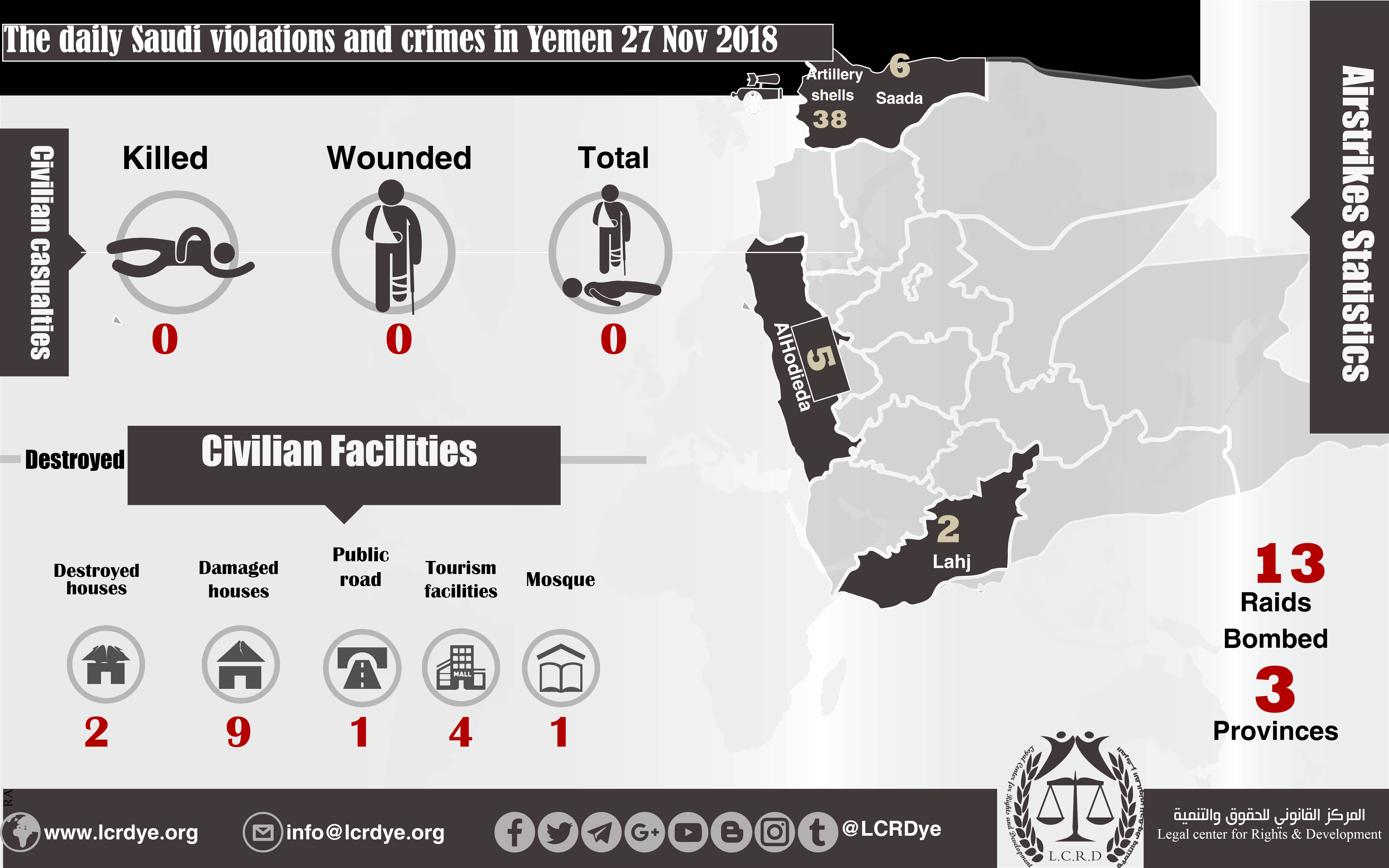 DAILY VIOLATION OBSERVATION REPORTS The daily report of the Saudi violations and crimes in Yemen 27 Nov 2018 Share For download: legal center for right and developmentSaudi coalition CrimesViolation war lawsYemen Share FacebookTwitterGoogle+ReddItWhatsAppPinterestEmail