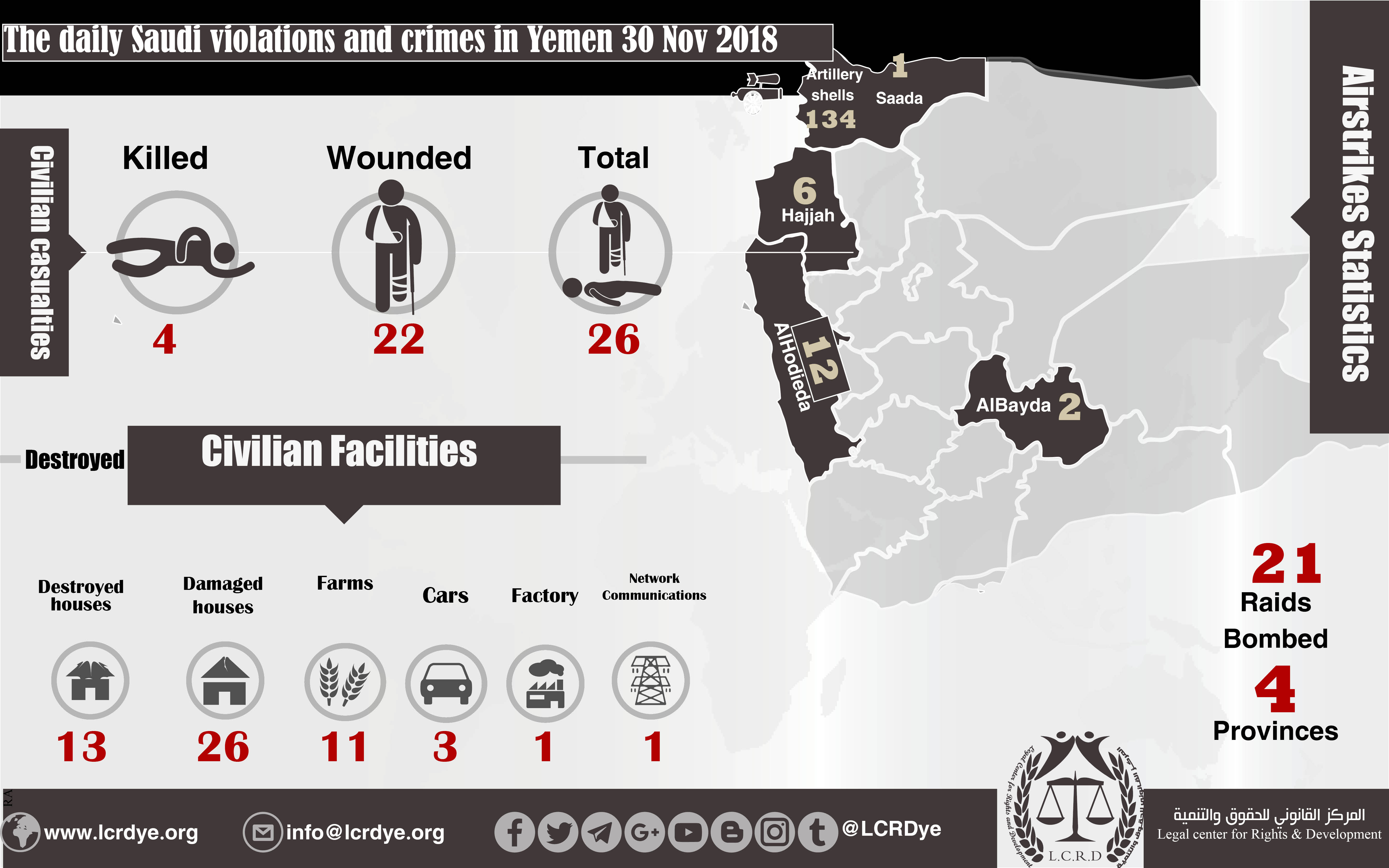 DAILY VIOLATION OBSERVATION REPORTS The daily report of the Saudi violations and crimes in Yemen 30 Nov 2018 Share For download: legal center for right and developmentSaudi coalition CrimesViolation war lawsYemen Share FacebookTwitterGoogle+ReddItWhatsAppPinterestEmail