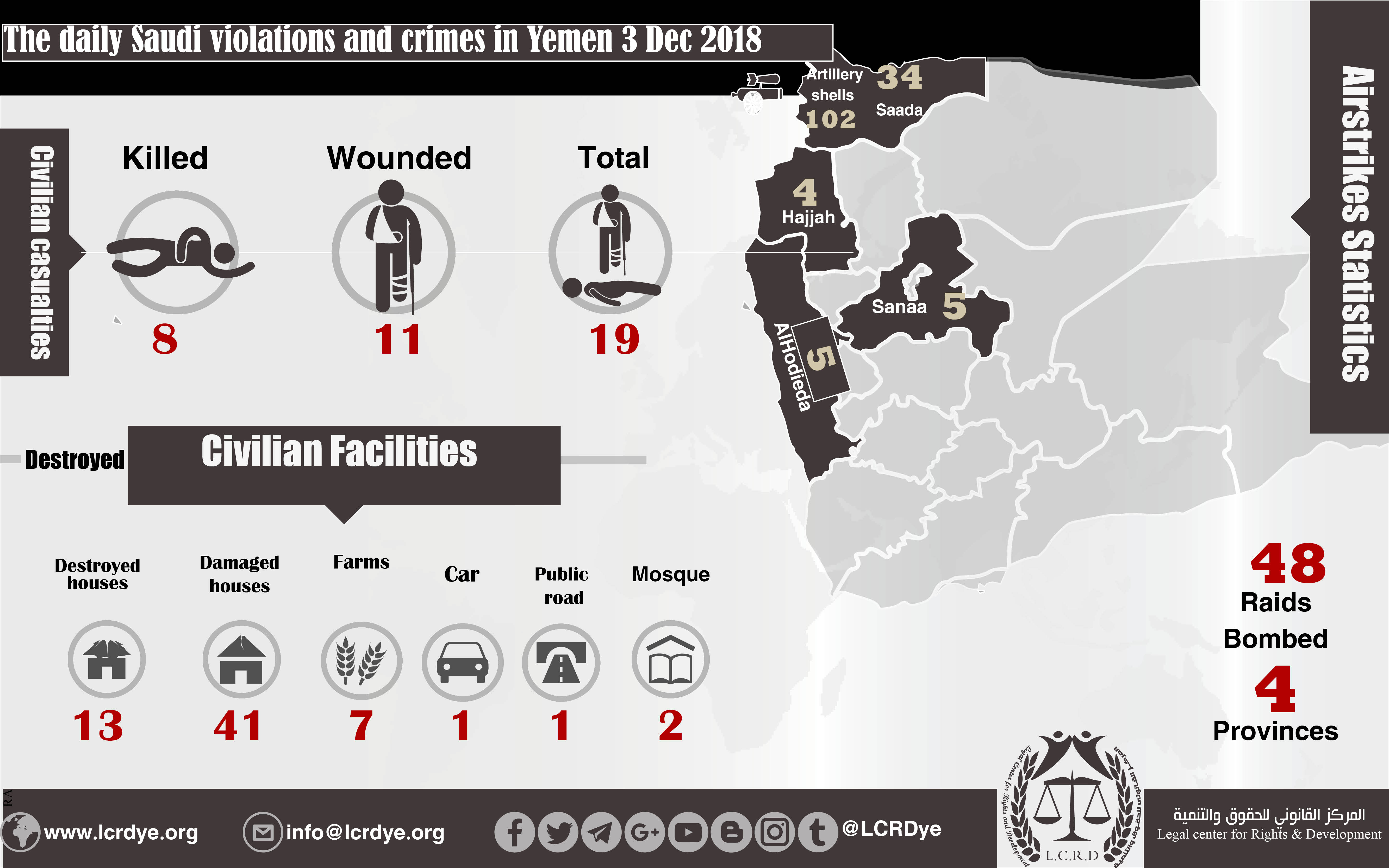 DAILY VIOLATION OBSERVATION REPORTS The daily report of the Saudi violations and crimes in Yemen 3 Dec 2018 Share For download: legal center for right and developmentViolation war lawsYemen Share FacebookTwitterGoogle+ReddItWhatsAppPinterestEmail