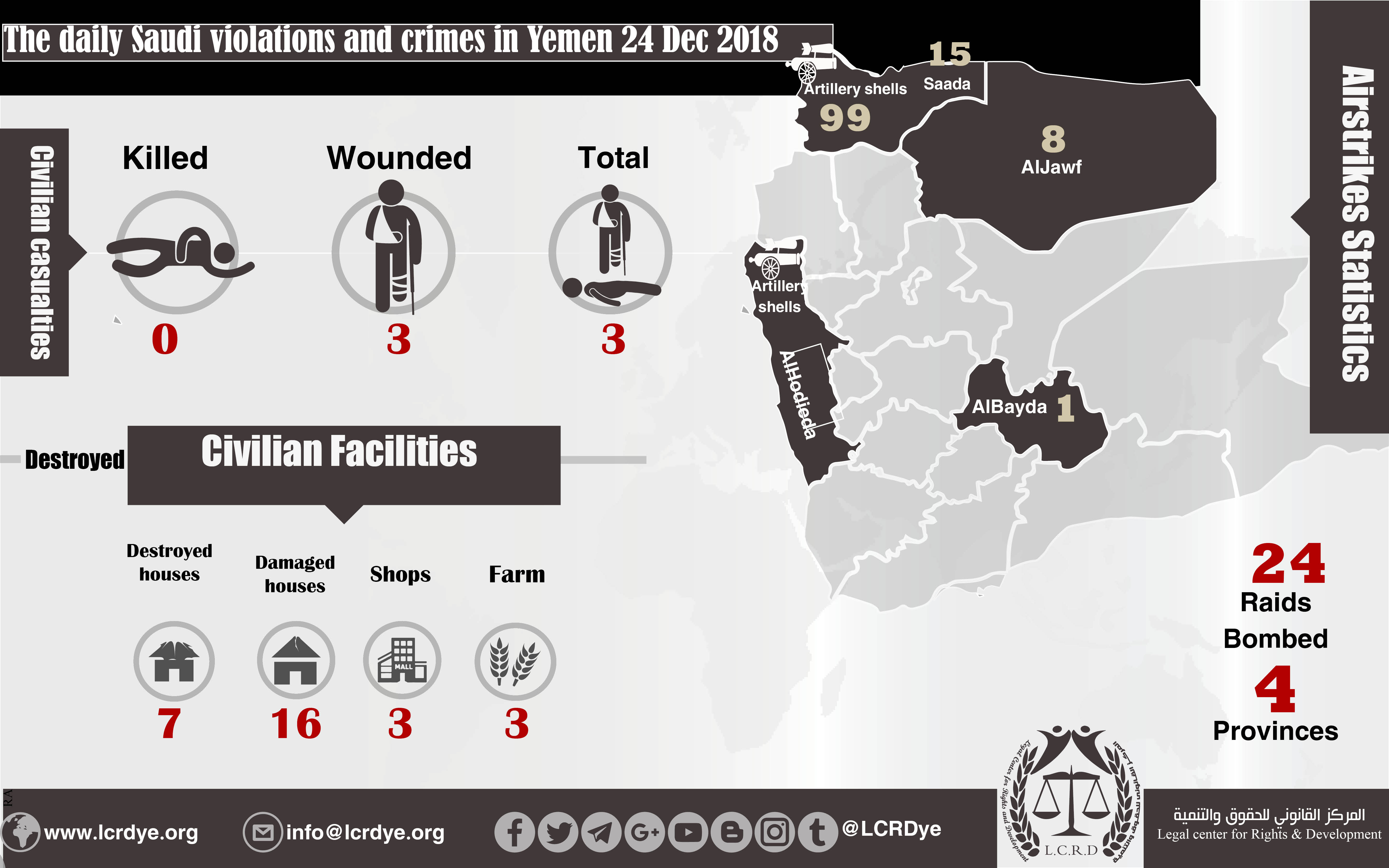 DAILY VIOLATION OBSERVATION REPORTS The daily report of the Saudi violations and crimes in Yemen 24 Dec 2018 Share For download: legal center for right and developmentSaudi coalition CrimesViolation war lawsYemen Share FacebookTwitterGoogle+ReddItWhatsAppPinterestEmail