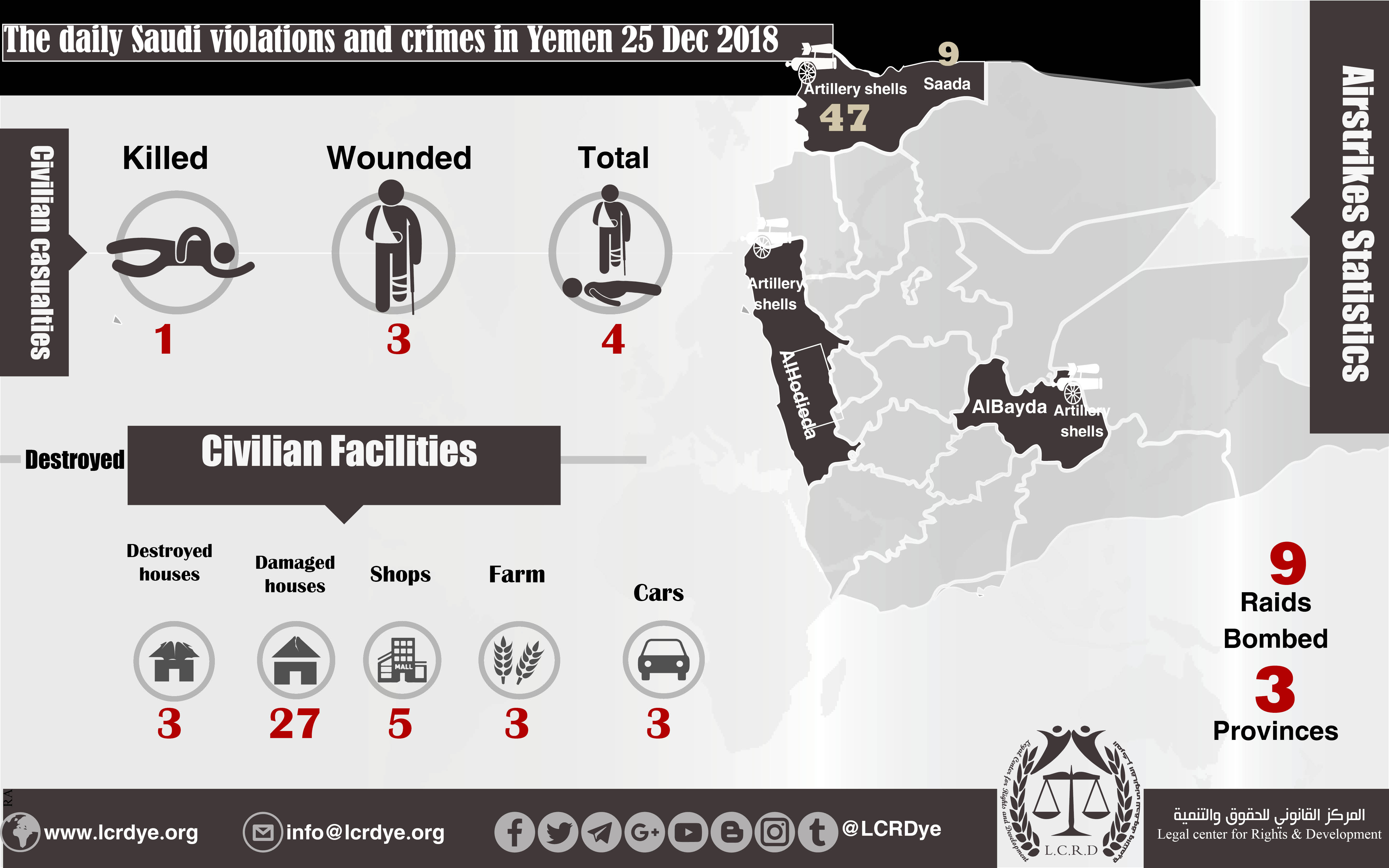 DAILY VIOLATION OBSERVATION REPORTS The daily report of the Saudi violations and crimes in Yemen 25 Dec 2018 Share For download: legal center for right and developmentSaudi coalition CrimesViolation war lawsYemen Share FacebookTwitterGoogle+ReddItWhatsAppPinterestEmail