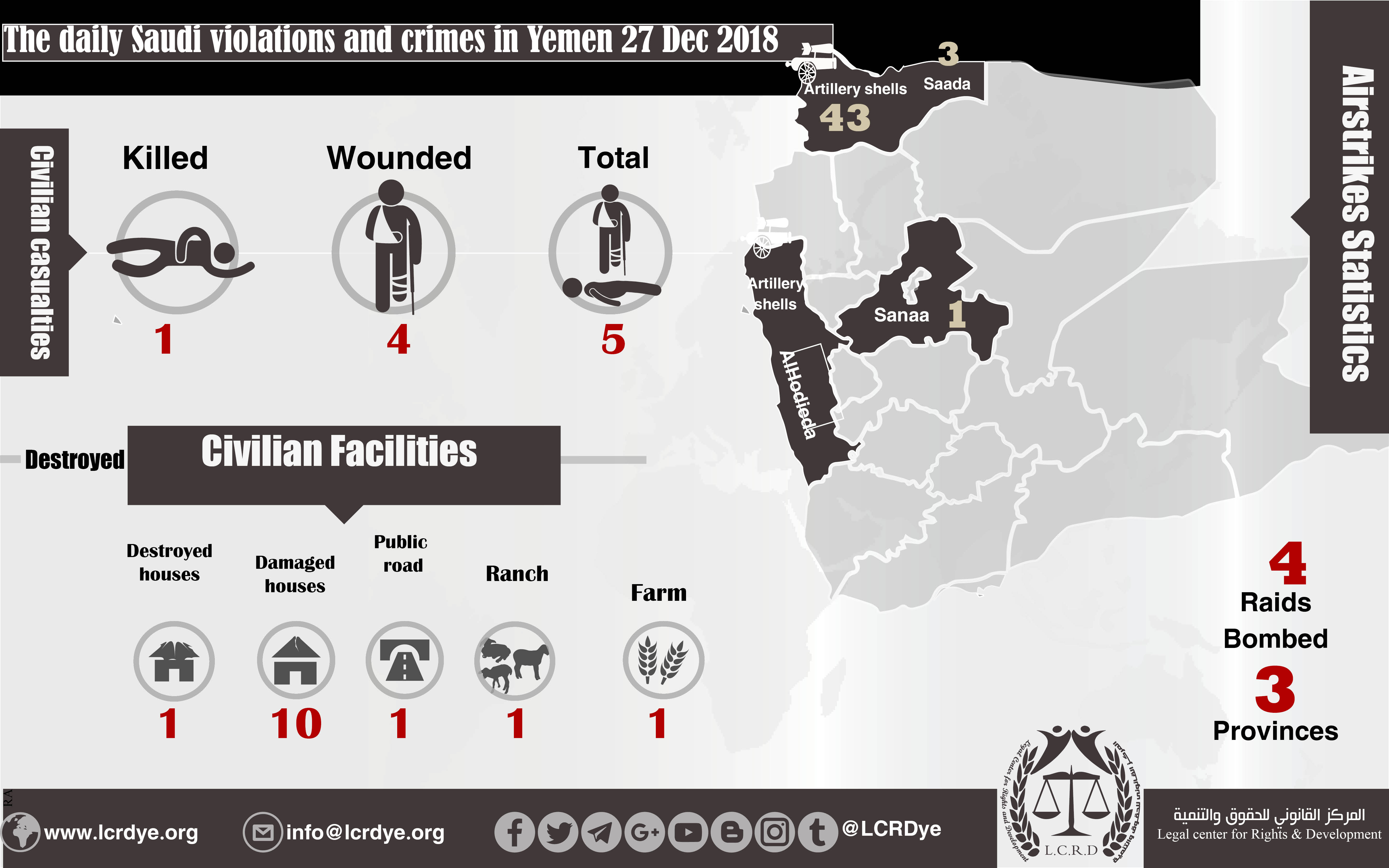 DAILY VIOLATION OBSERVATION REPORTS The daily report of the Saudi violations and crimes in Yemen 27 Dec 2018 Share For download: legal center for right and developmentSaudi coalition CrimesViolation war lawsYemen Share FacebookTwitterGoogle+ReddItWhatsAppPinterestEmail