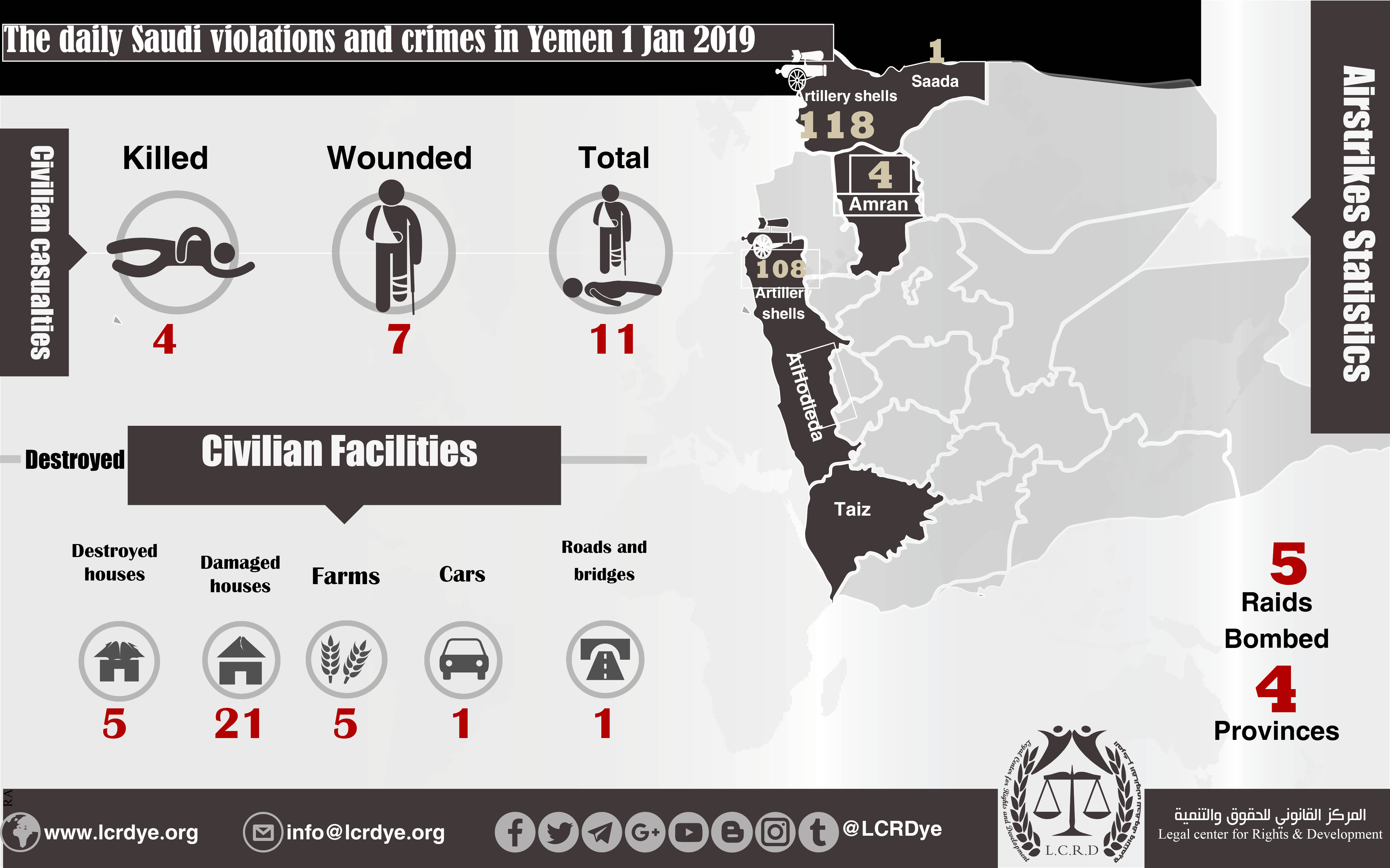 DAILY VIOLATION OBSERVATION REPORTS The daily report of the Saudi violations and crimes in Yemen 1 Jan 2019 Share For download: legal center for right and developmentSaudi coalition CrimesViolation war lawsYemen Share FacebookTwitterGoogle+ReddItWhatsAppPinterestEmail