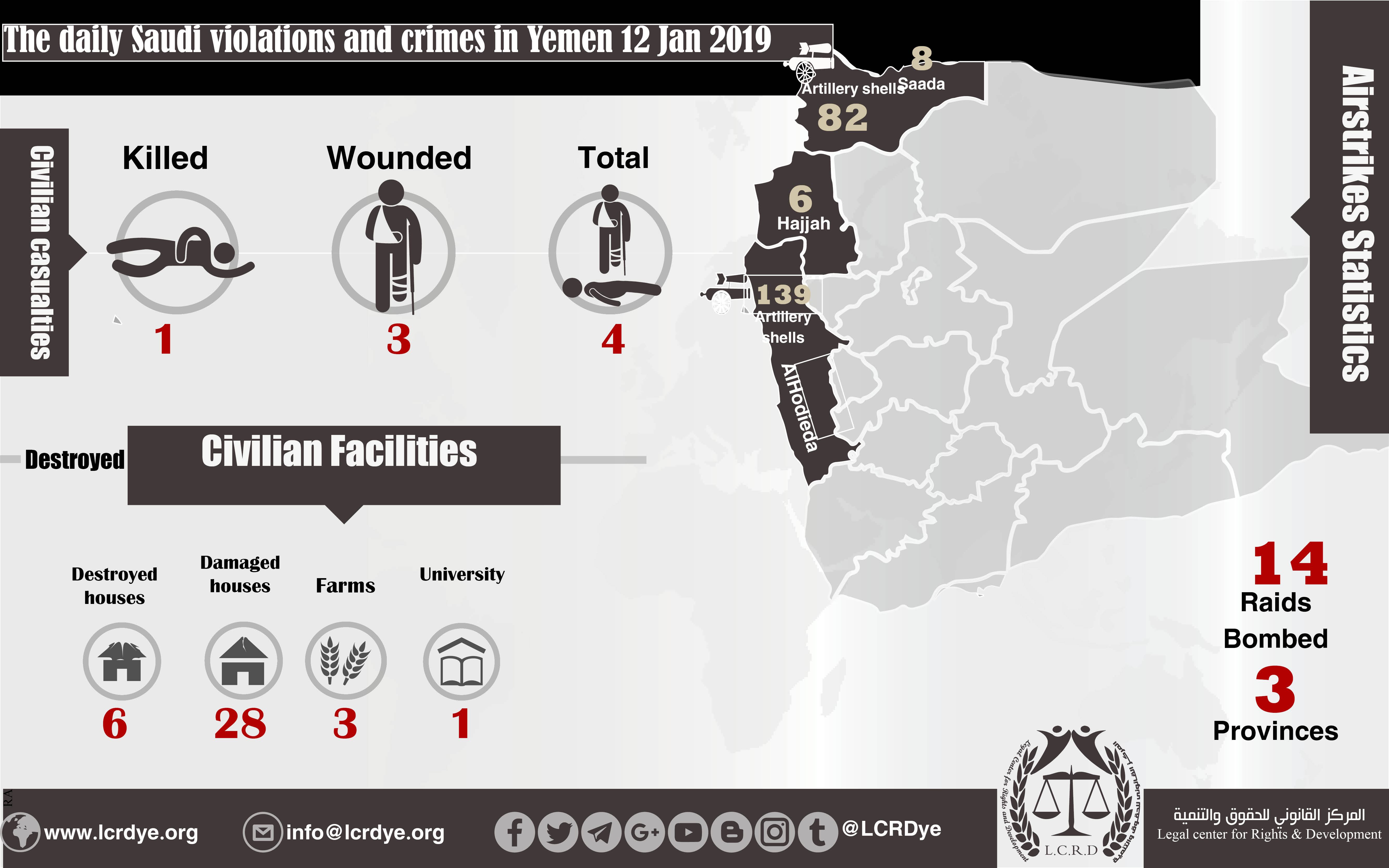 DAILY VIOLATION OBSERVATION REPORTS The daily report of the Saudi violations and crimes in Yemen 12 Jan 2019 Share For download: legal center for right and developmentSaudi coalition CrimesViolation war lawsYemen Share FacebookTwitterGoogle+ReddItWhatsAppPinterestEmail