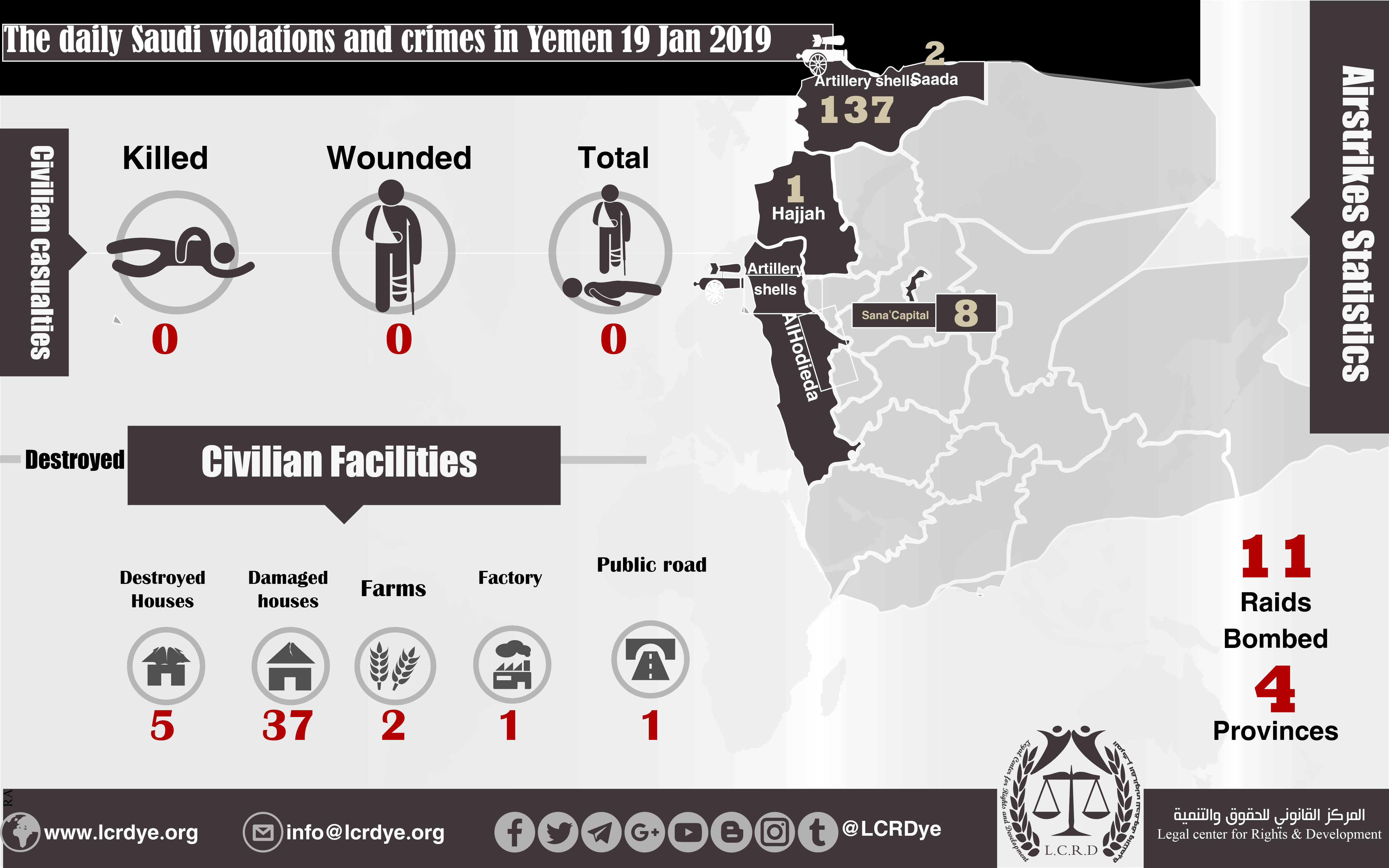DAILY VIOLATION OBSERVATION REPORTS The daily report of the Saudi violations and crimes in Yemen 19 Jan 2019 Share For download: legal center for right and developmentSaudi coalition CrimesViolation war lawsYemen Share FacebookTwitterGoogle+ReddItWhatsAppPinterestEmail