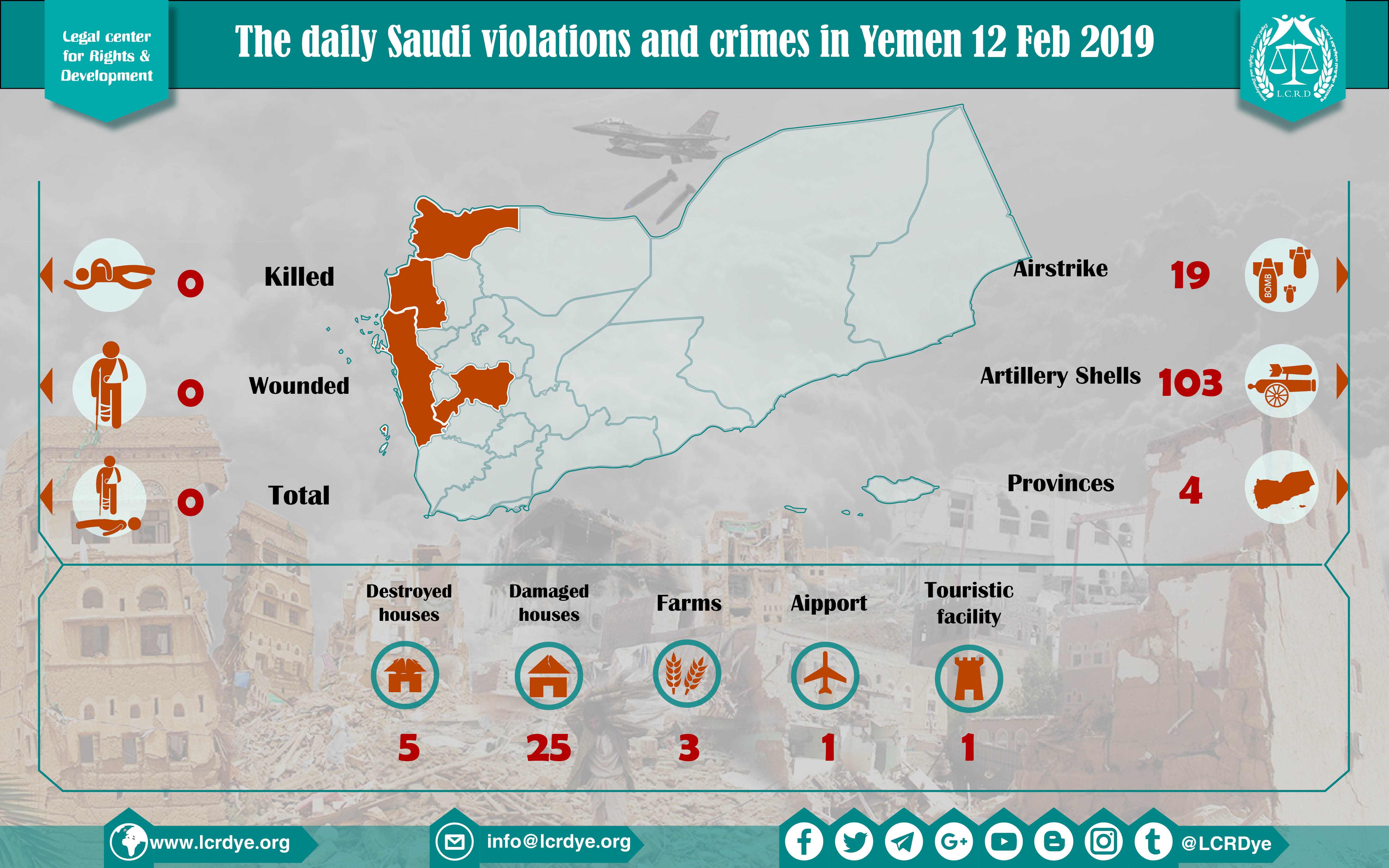 DAILY VIOLATION OBSERVATION REPORTS The daily report of the Saudi violations and crimes in Yemen 12 Feb 2019 Share For download: legal center for right and developmentSaudi coalition CrimesViolation war lawsYemen Share FacebookTwitterGoogle+ReddItWhatsAppPinterestEmail