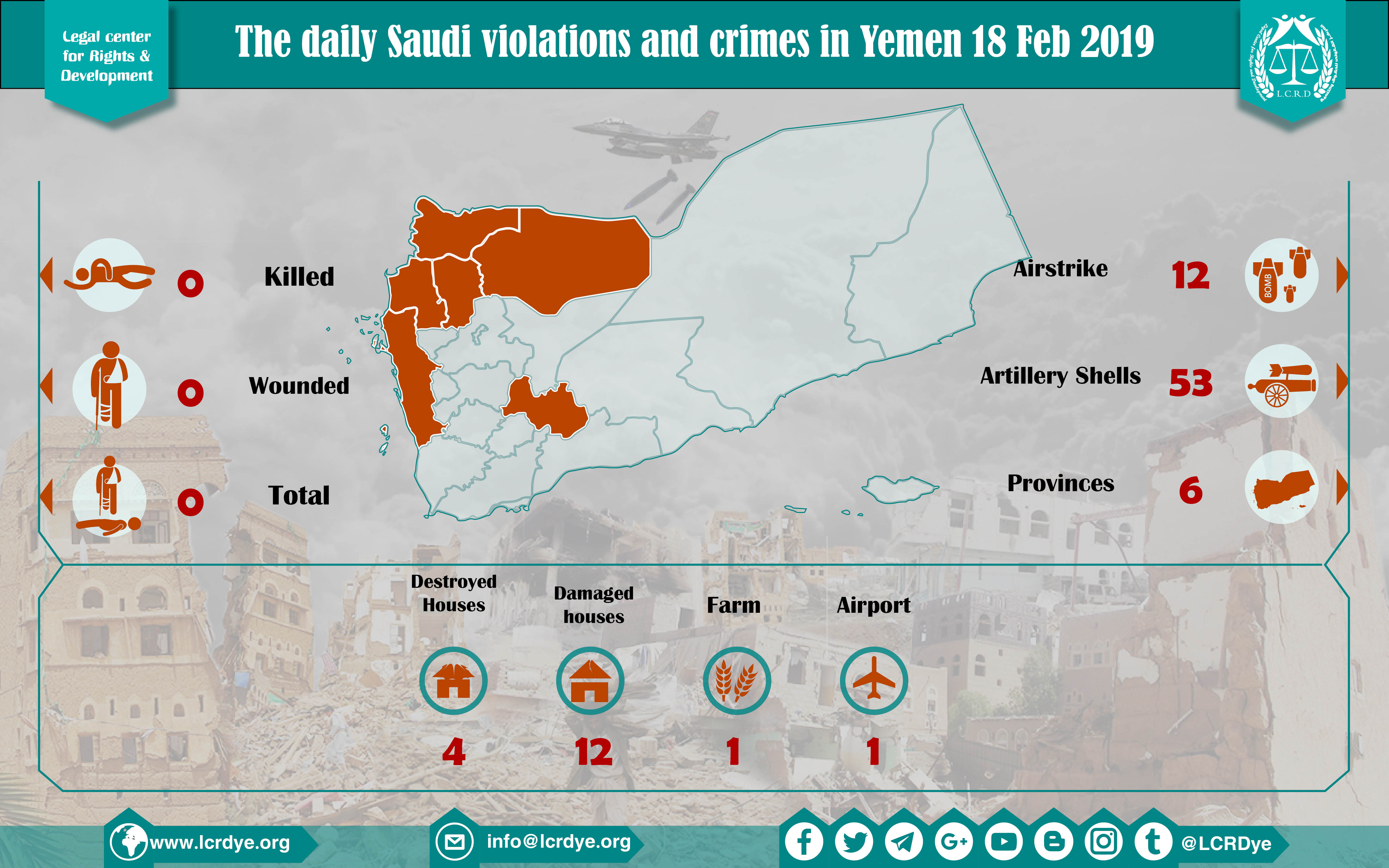 DAILY VIOLATION OBSERVATION REPORTS The daily report of the Saudi violations and crimes in Yemen 18 Feb 2019 Share For download: legal center for right and developmentSaudi coalition CrimesViolation war lawsYemen Share FacebookTwitterGoogle+ReddItWhatsAppPinterestEmail