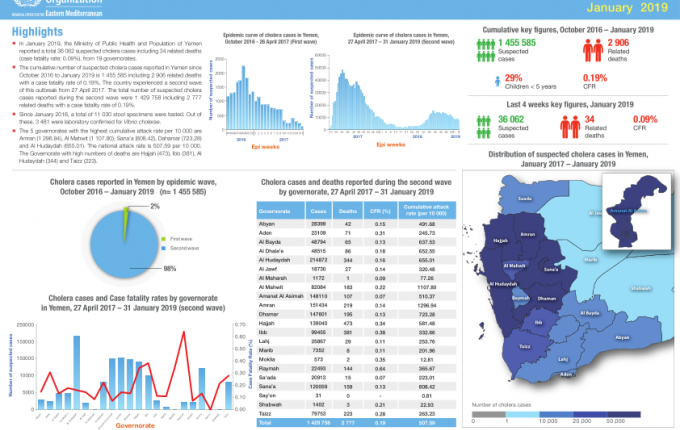 Cholera situation in Yemen, January 2019 Share https://reliefweb.int/report/yemen/cholera-situation-yemen-january-2019 CHOLERA SITUATION IN YEMENInternational Info-graphicJanuary 2019 Share FacebookTwitterGoogle+ReddItWhatsAppPinterestEmail