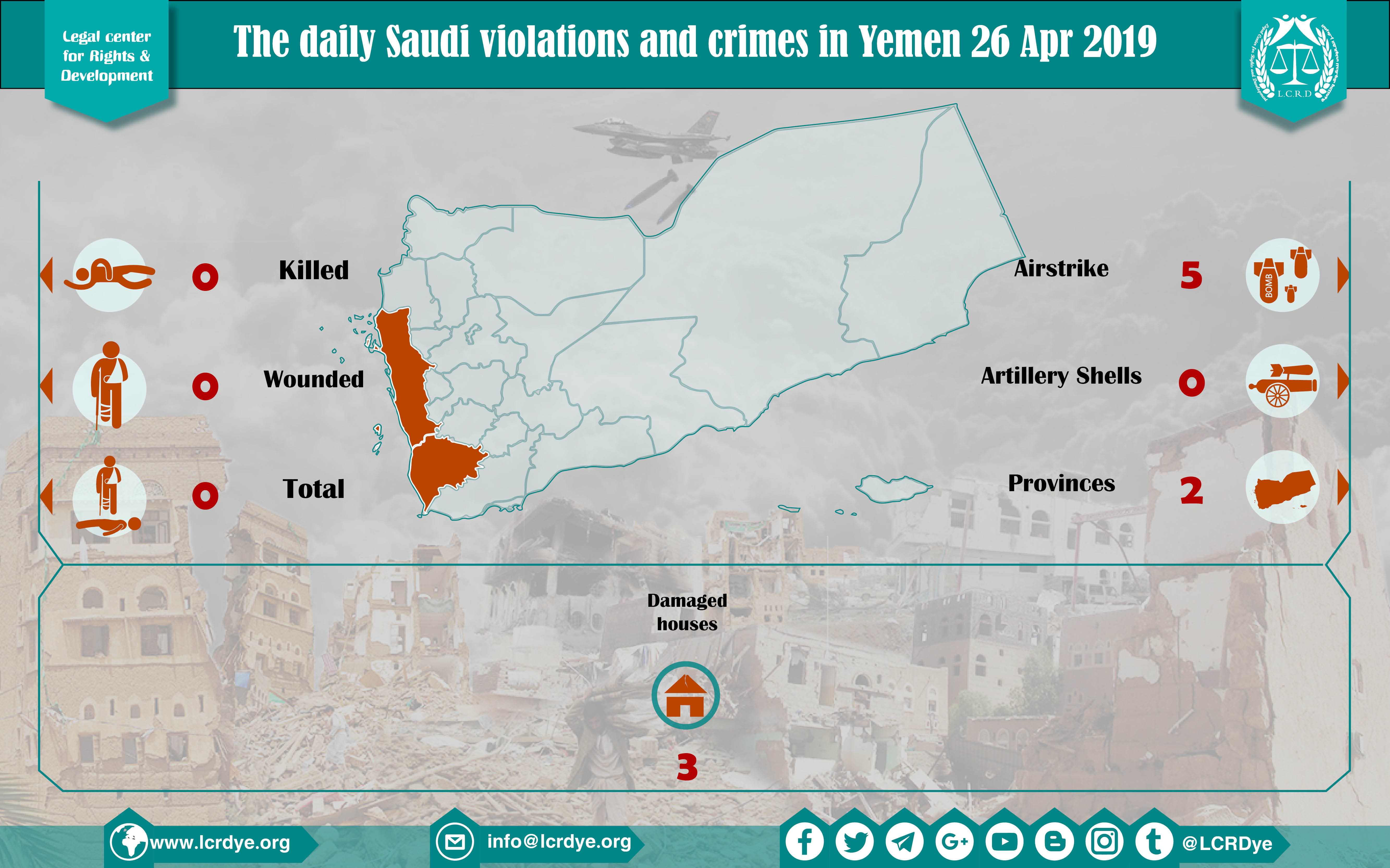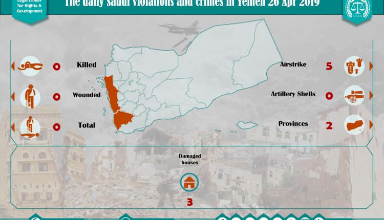 DAILY VIOLATION OBSERVATION REPORTS The Daily Report Of The Saudi Violations And Crimes In Yemen 26 Apr 2019 Share For download: legal center for right and developmentSaudi coalition CrimesViolation war lawsYemen Share FacebookTwitterGoogle+ReddItWhatsAppPinterestEmail