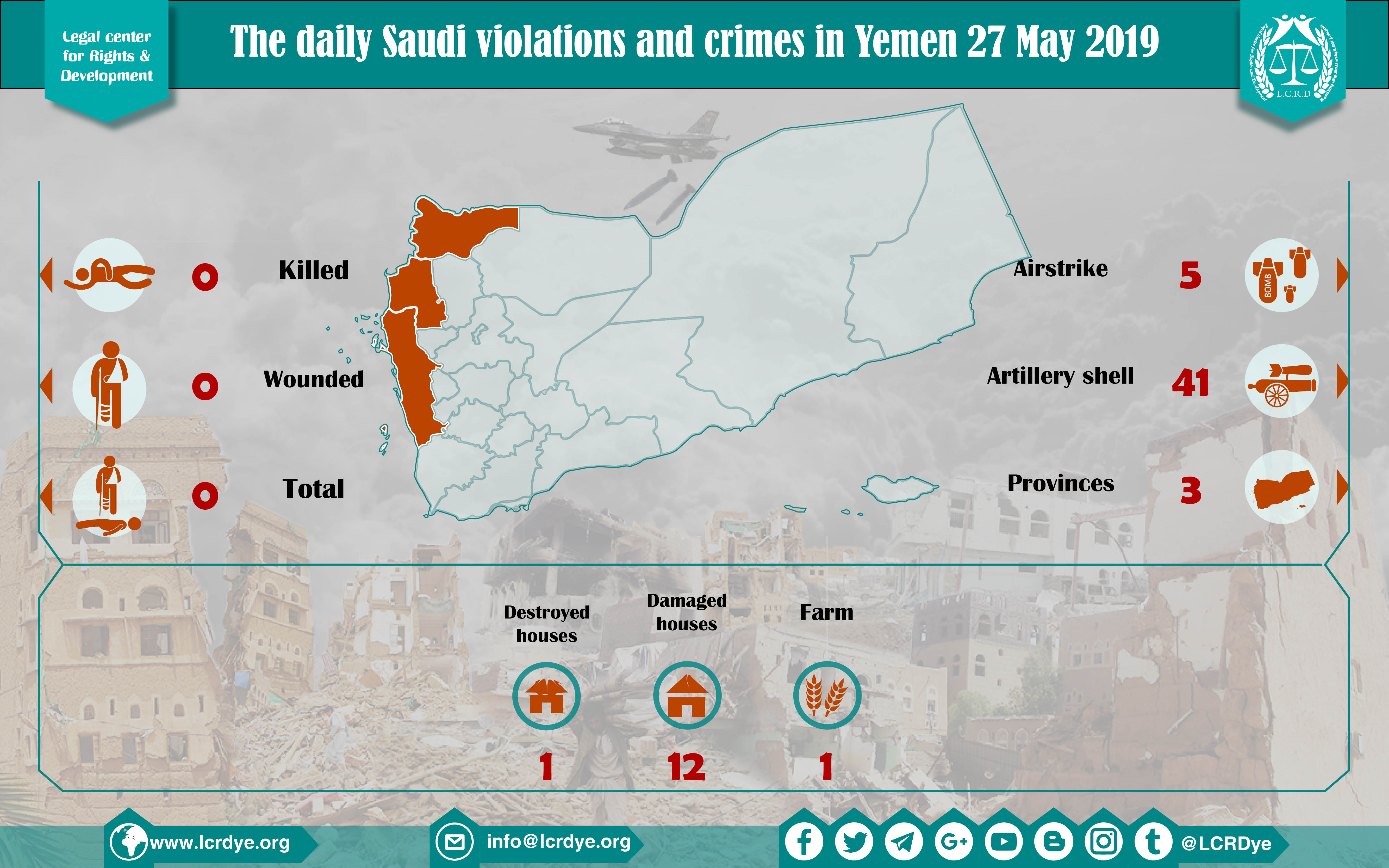 DAILY VIOLATION OBSERVATION REPORTS The Daily Report Of The Saudi Violations And Crimes In Yemen 27 May 2019 Share For download: legal center for right and developmentSaudi coalition CrimesViolation war lawsYemen Share FacebookTwitterGoogle+ReddItWhatsAppPinterestEmail