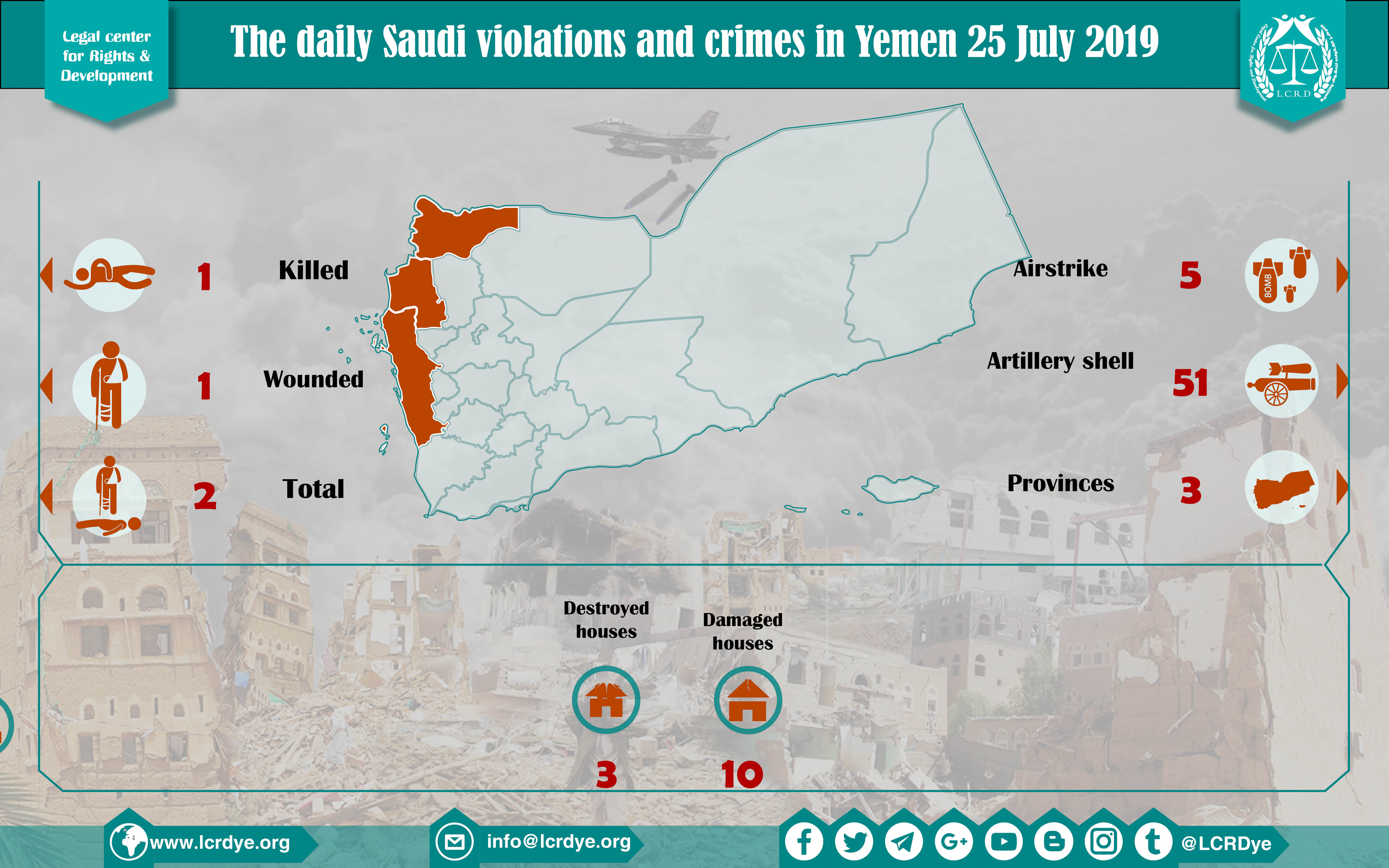 DAILY VIOLATION OBSERVATION REPORTS The Daily Report Of The Saudi Violations And Crimes In Yemen 25 July 2019 Share legal center for right and developmentSaudi coalition CrimesViolation war lawsYemen Share FacebookTwitterGoogle+ReddItWhatsAppPinterestEmail