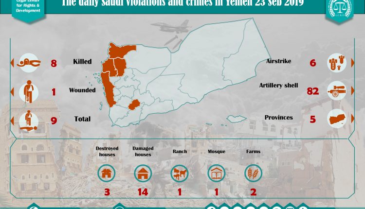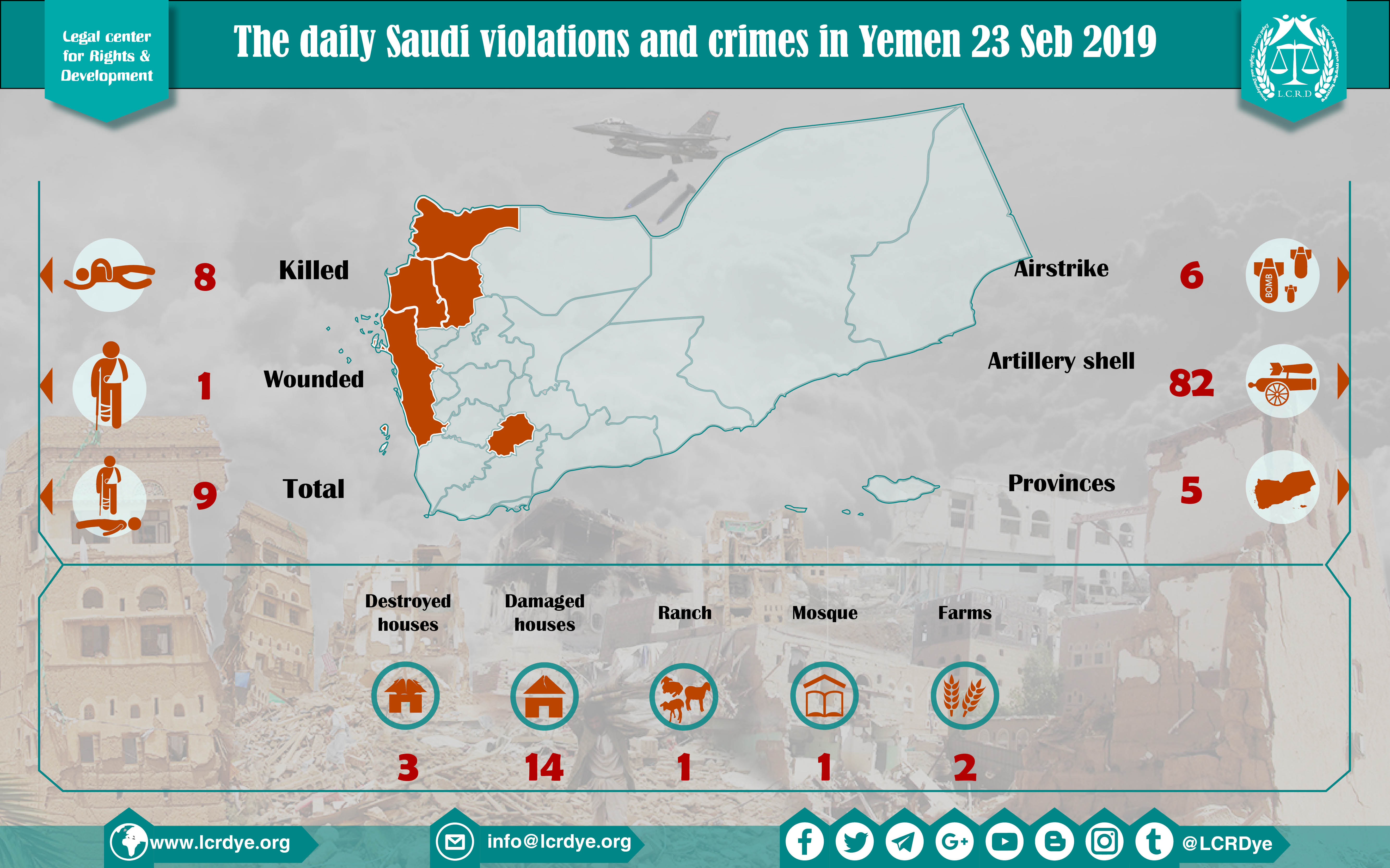 DAILY VIOLATION OBSERVATION REPORTS The Daily Report Of The Saudi Violations And Crimes In Yemen 23 Seb 2019 Share legal center for right and developmentSaudi coalition CrimesViolation war lawsYemen Share FacebookTwitterGoogle+ReddItWhatsAppPinterestEmail