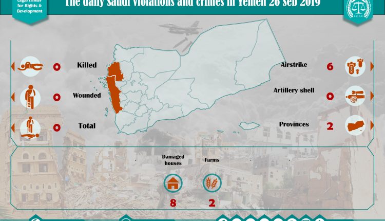 DAILY VIOLATION OBSERVATION REPORTS The Daily Report Of The Saudi Violations And Crimes In Yemen 26 Seb 2019 Share legal center for right and developmentSaudi coalition CrimesViolation war lawsYemen Share FacebookTwitterGoogle+ReddItWhatsAppPinterestEmail