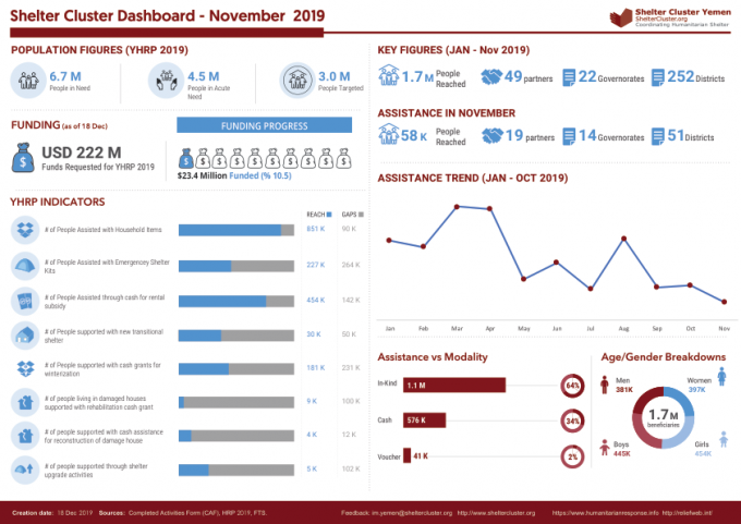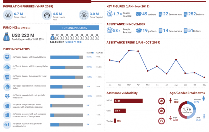 Yemen: Shelter Cluster Dashboard – November 2019 Share https://reliefweb.int/report/yemen/yemen-shelter-cluster-dashboard-november-2019 https://reliefweb.int/sites/reliefweb.int/files/resources/shelter_cluster_dashboard_-_november_2019.pdf International Info-graphicYemen: Shelter Cluster Dashboard - November 2019 Share FacebookTwitterGoogle+ReddItWhatsAppPinterestEmail