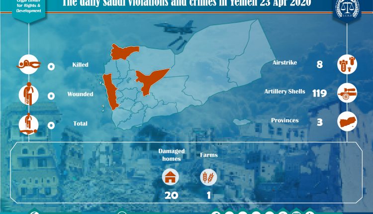 Primary Statistic Of The Violation And Crimes That Are Committed By Saudi Arabia And Its Alliance In Yemen 23 Apr 2020 Share legal center for right and developmentSaudi coalition CrimesYemen Share FacebookTwitterGoogle+ReddItWhatsAppPinterestEmail