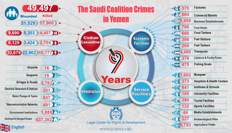 English – Statistic of 9 Years – The Saudi Coalition Crimes in Yemen Share International Info-graphiclegal center for right and developmentSaudi coalition Crimestargeted civilians Share FacebookTwitterGoogle+ReddItWhatsAppPinterestEmail
