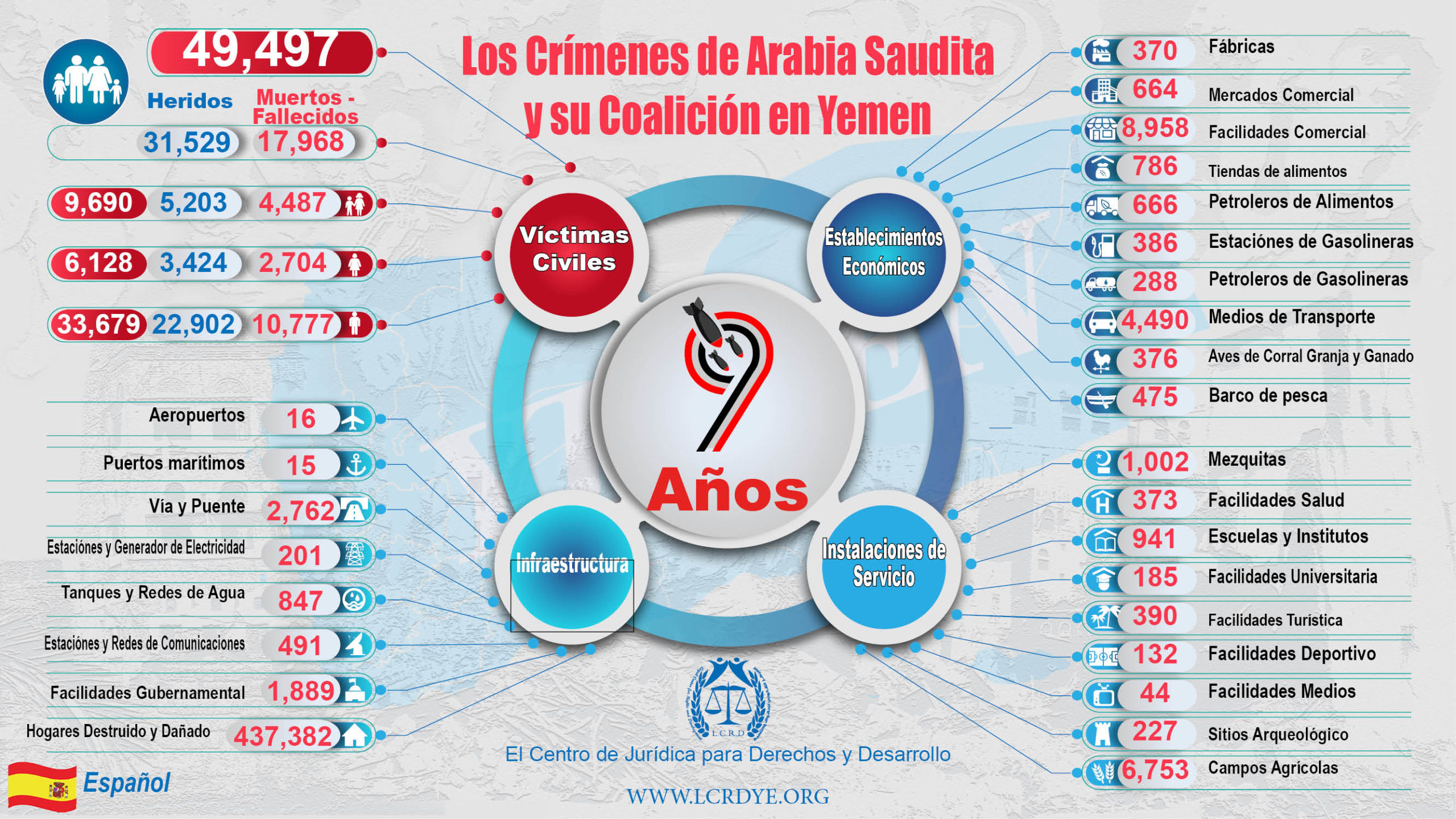 Español – Las Estadísticas de 9 Años – Los Crímenes de Arabia Saudita y su Coalición en Yemen Share International Info-graphiclegal center for right and developmentSaudi coalition Crimestargeted civilianstargeted facilitiestargeted infrastructureTargeting civilians Share FacebookTwitterGoogle+ReddItWhatsAppPinterestEmail