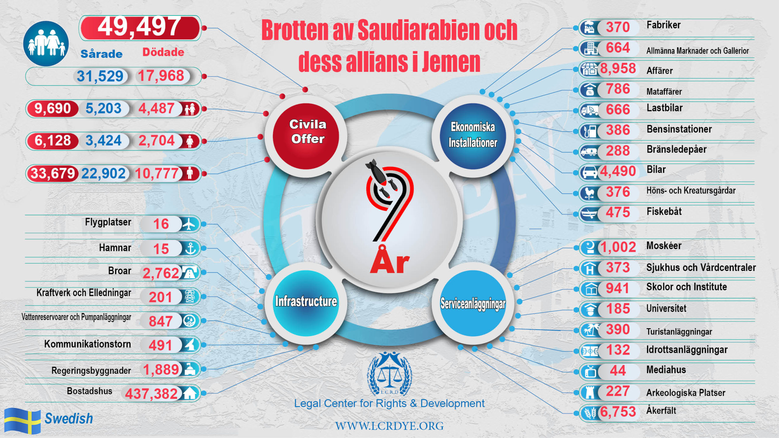 Swedish – Resultatet av 9 År – Brotten av Saudiarabien och dess allians i Jemen Share International Info-graphiclegal center for right and developmentSaudi coalition Crimestargeted civilianstargeted facilitiestargeted infrastructureTargeting civilians Share FacebookTwitterGoogle+ReddItWhatsAppPinterestEmail