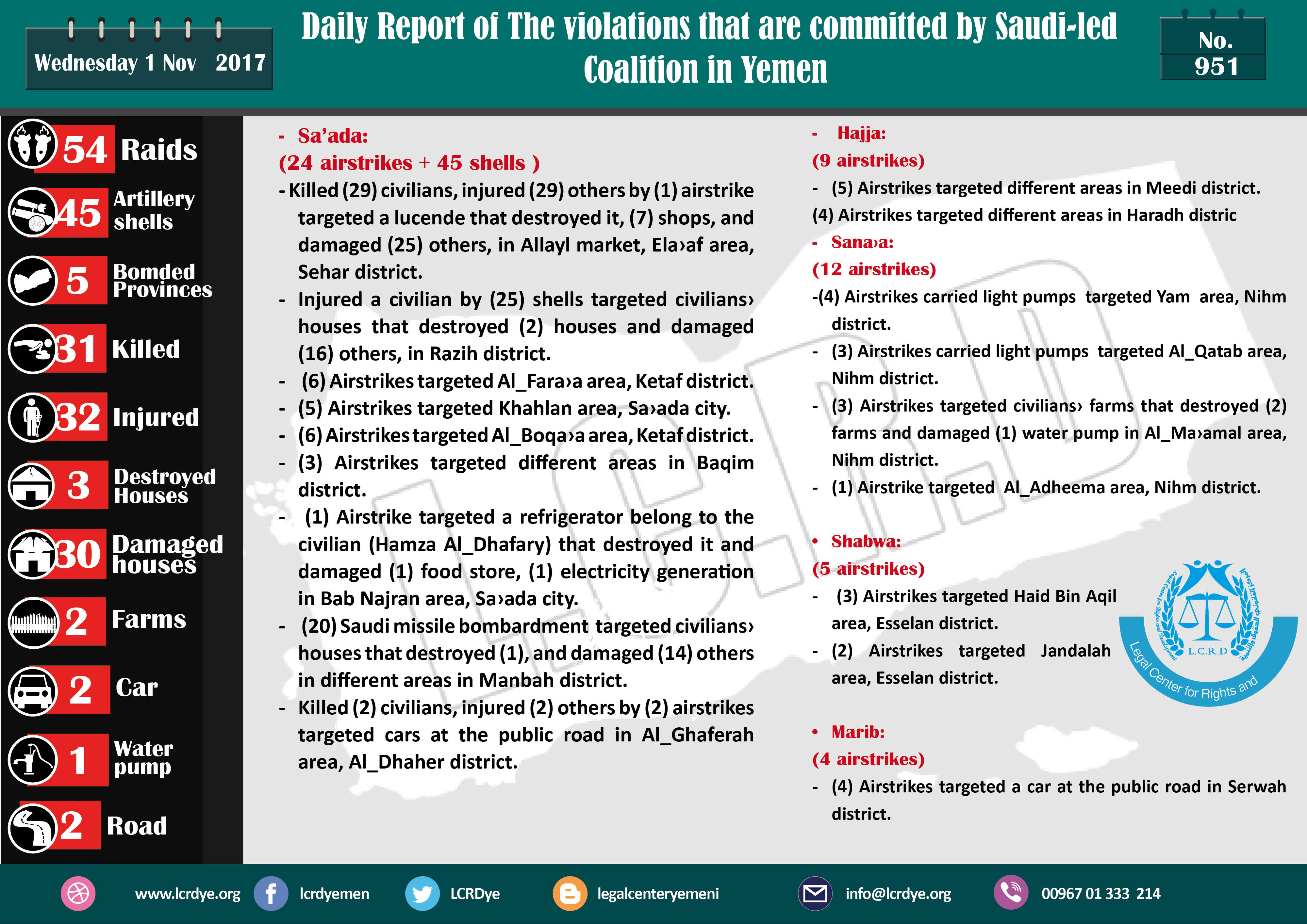 The Violation and Crimes that are committed by the Saudi Arabia and its collation in 1_11_2017 Share legal center for right and developmentTargeting InfrastructureViolation war lawsYemen Share FacebookTwitterGoogle+ReddItWhatsAppPinterestEmail