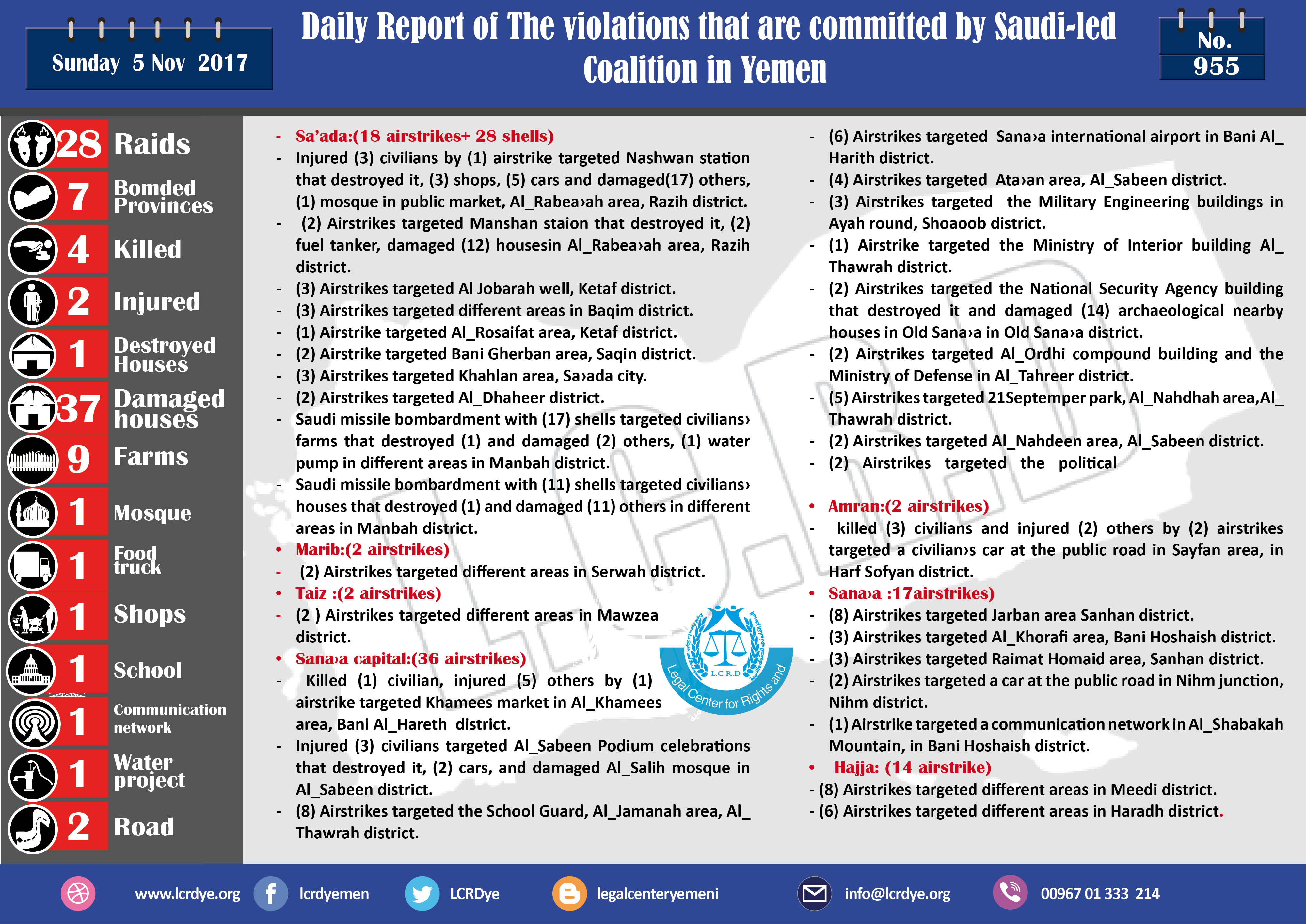 The Violation and Crimes that are committed by the Saudi Arabia and its collation in 5_11_2017 Share legal center for right and developmentSaudi coalition Crimestargeted facilitiesTargeting civiliansTargeting InfrastructureYemen Share FacebookTwitterGoogle+ReddItWhatsAppPinterestEmail