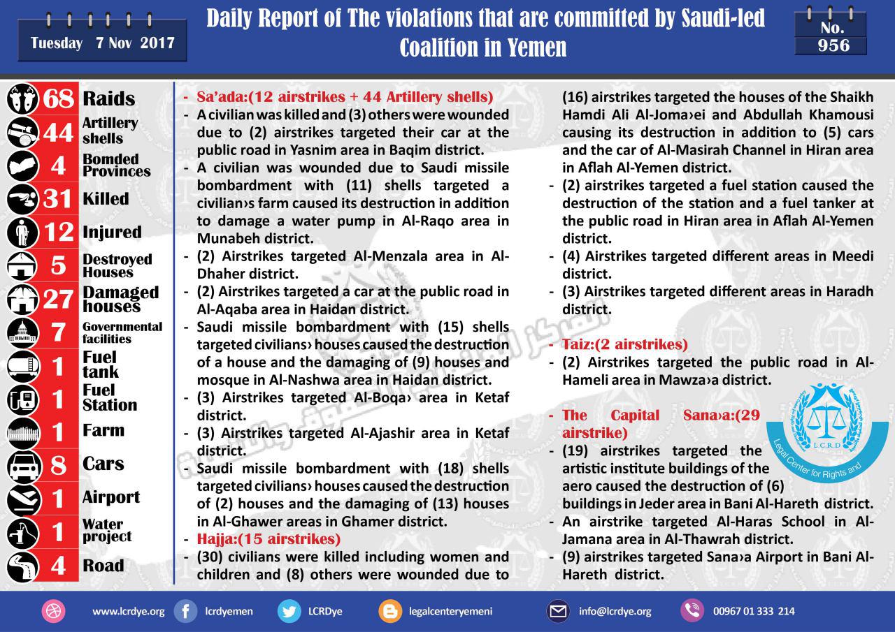 The Violation and Crimes that are committed by the Saudi Arabia and its collation in 7_11_2017 Share legal center for right and developmentTargeting InfrastructureViolation war lawsYemen Share FacebookTwitterGoogle+ReddItWhatsAppPinterestEmail