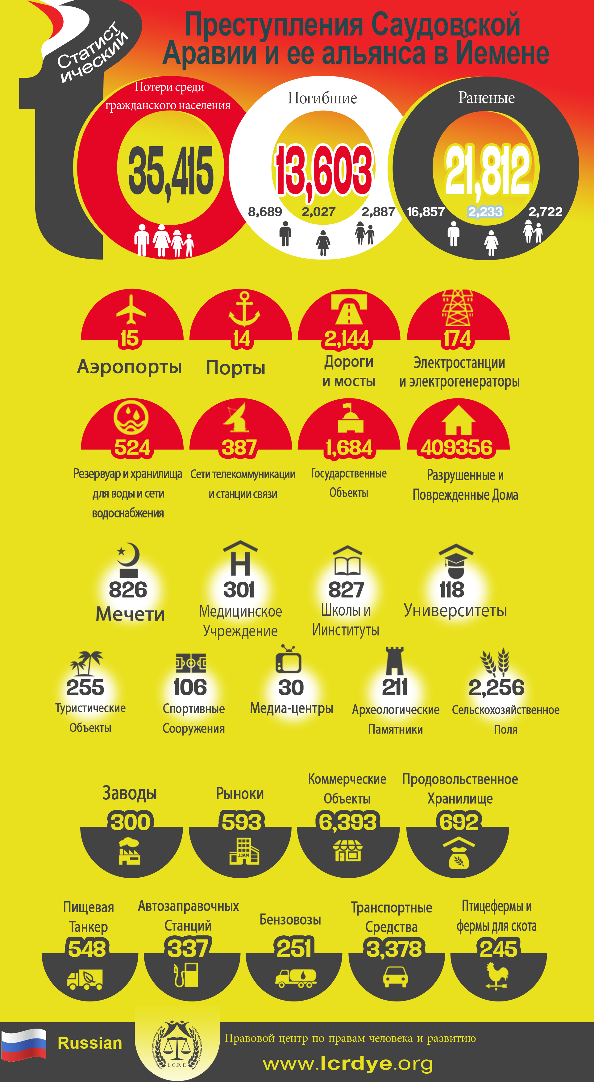 Статистический 1000 день – Преступления Саудовской Аравии и ее союз в Йемене Share Russian: Статистический 1000 день Преступления Саудовской Аравии и ее союз в Йемене legal center for right and developmentSaudi coalition Crimestargeted civilianstargeted facilitiestargeted infrastructureTargeting civiliansTargeting InfrastructureViolation war laws Share FacebookTwitterGoogle+ReddItWhatsAppPinterestEmail