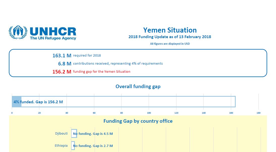 Yemen Situation 2018 Funding Update as of 13 February 2018 All figures are displayed in USD Share UNHCRYemenYemen Situation 2018 Funding Update as of 13 February 2018 All figures are displayed in USD Share FacebookTwitterGoogle+ReddItWhatsAppPinterestEmail