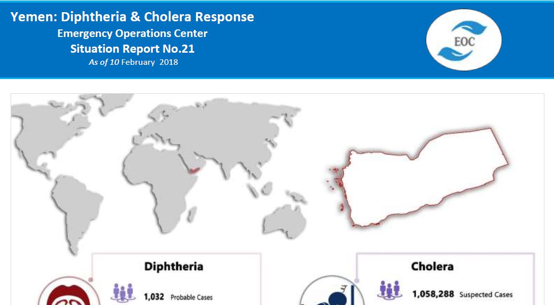 Yemen: Diphtheria & Cholera Response Emergency Operations Center Situation Report No.21 As of 10 February 2018 Share YemenYemen: Diphtheria & Cholera Response Emergency Operations Share FacebookTwitterGoogle+ReddItWhatsAppPinterestEmail