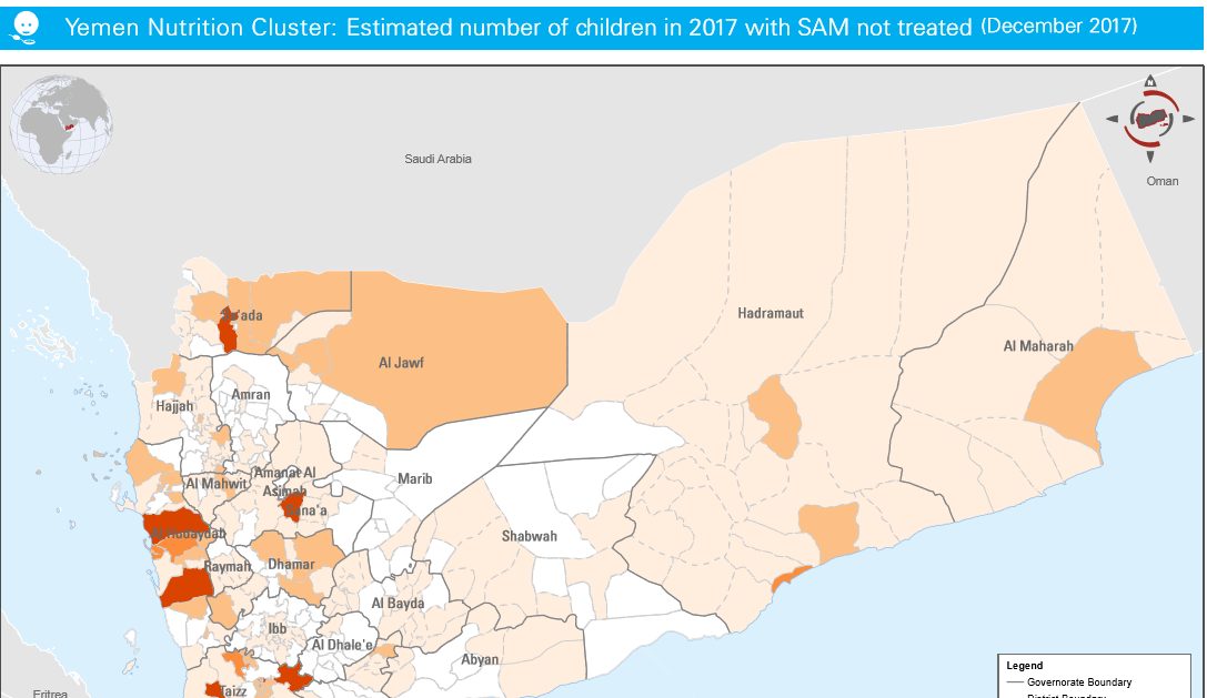 Yemen Nutrition Cluster: Estimated number of children in 2017 with SAM not treated (December 2017) Share Yemen Nutrition Cluster: Estimated number of children Share FacebookTwitterGoogle+ReddItWhatsAppPinterestEmail