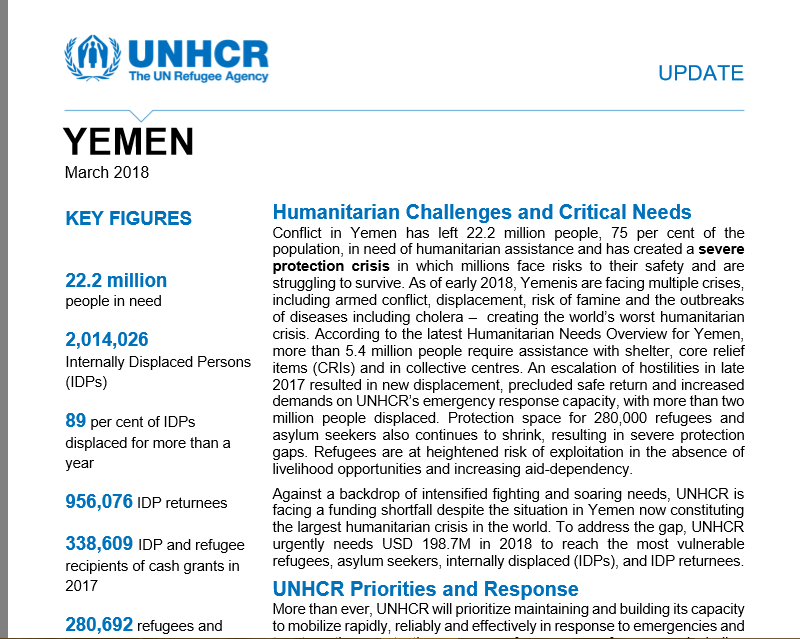 Yemen UNHCR Update, March 2018 Share March 2018UN High Commissioner for RefugeesYemen UNHCR Update Share FacebookTwitterGoogle+ReddItWhatsAppPinterestEmail