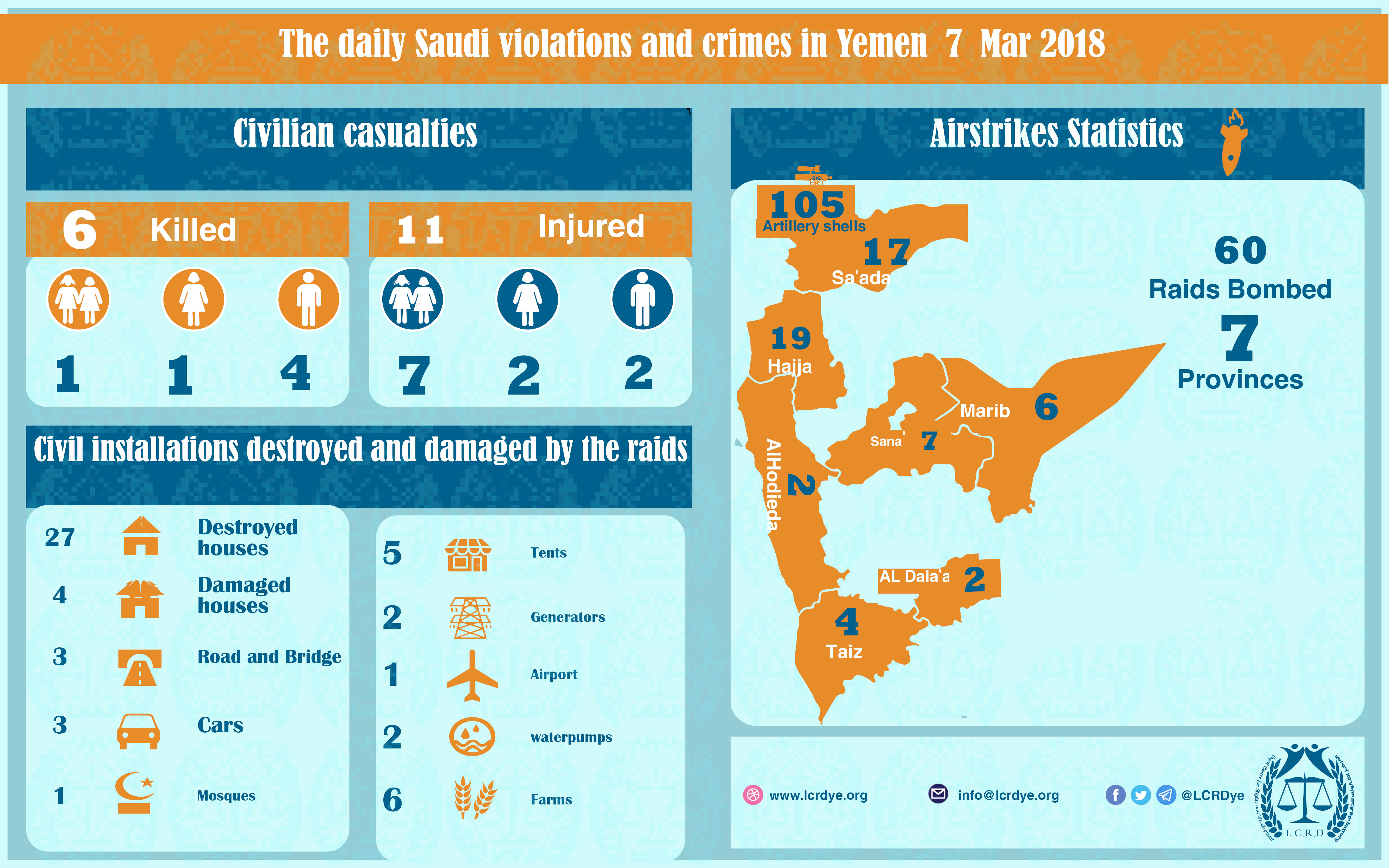 DAILY VIOLATION OBSERVATION REPORTS The Violation and Crimes that are committed by the Saudi Arabia and its collation in 7_3_2018 Share For download https://www.lcrdye.org/wp-content/uploads/2018/03/7-Mar-2018.pdf legal center for right and developmentSaudi coalition CrimesViolation war lawsYemen Share FacebookTwitterGoogle+ReddItWhatsAppPinterestEmail