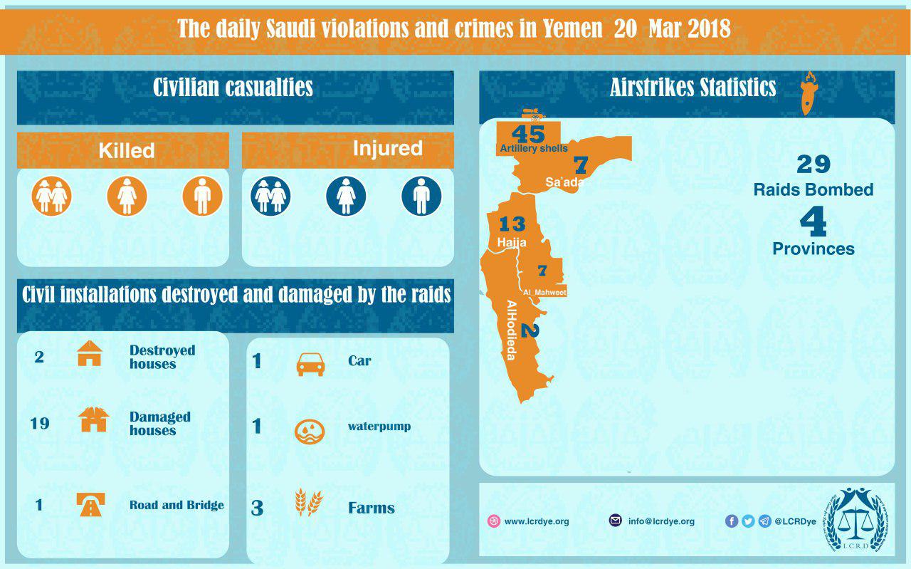 DAILY VIOLATION OBSERVATION REPORTS DAILY VIOLATION OBSERVATION REPORTS The Violation and Crimes that are committed by the Saudi Arabia and its collation in 20_3_2018 Share For download https://www.lcrdye.org/wp-content/uploads/2018/03/20-Mar-2018.pdf legal center for right and developmentSaudi coalition CrimesViolation war lawsYemen Share FacebookTwitterGoogle+ReddItWhatsAppPinterestEmail