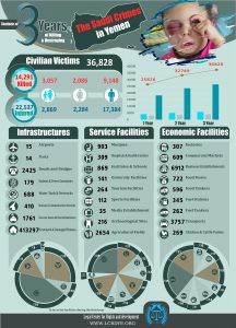 Infographic| Statistic of 3 Years – The Saudi Crimes in Yemen Share legal center for right and developmentStatistic of 3 Years – The Saudi Crimes in Yementargeted civilianstargeted infrastructureViolation war lawsYemen Share FacebookTwitterGoogle+ReddItWhatsAppPinterestEmail