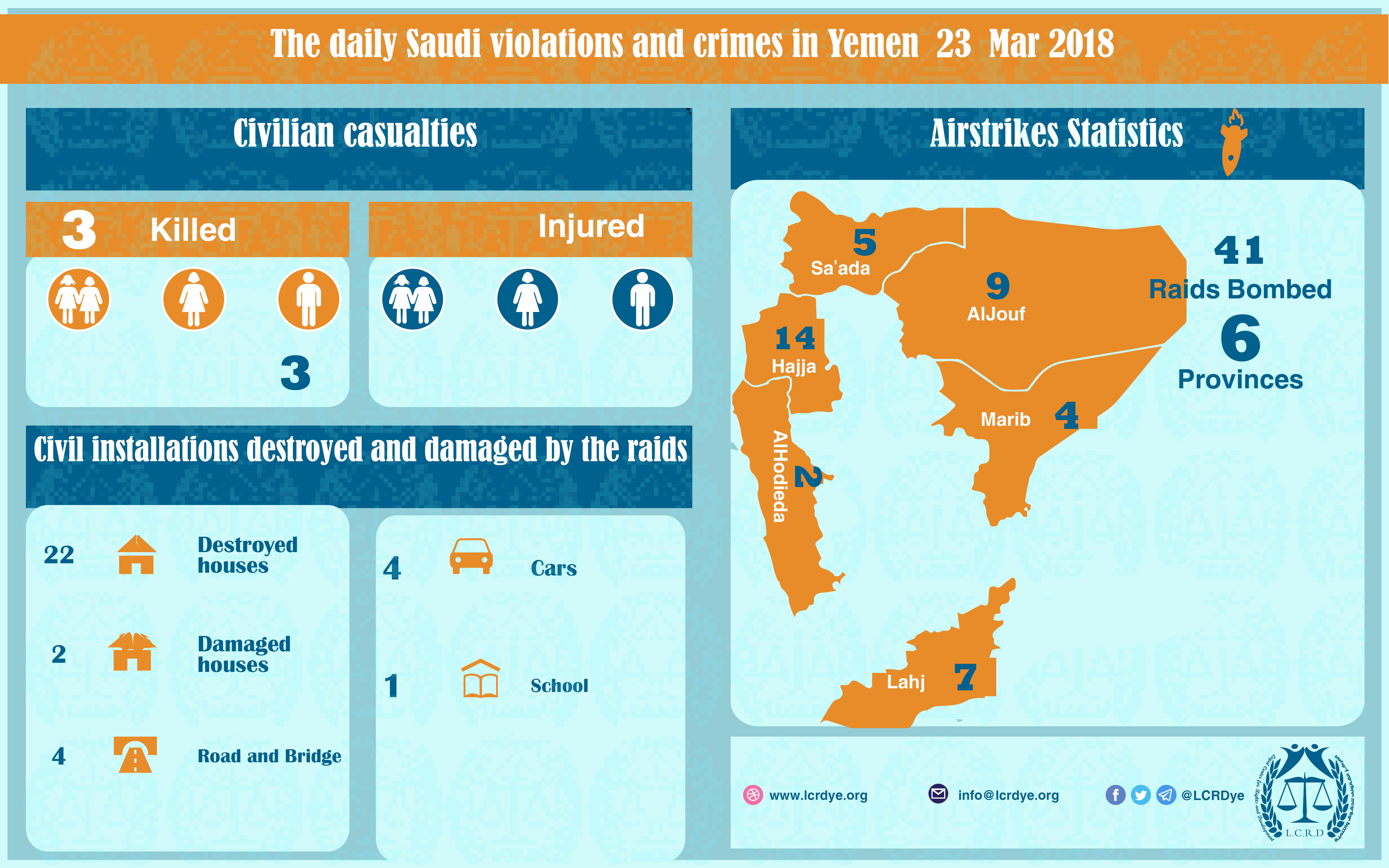 DAILY VIOLATION OBSERVATION REPORTS DAILY VIOLATION OBSERVATION REPORTS The Violation and Crimes that are committed by the Saudi Arabia and its collation in 23_3_2018 Share For download https://www.lcrdye.org/wp-content/uploads/2018/03/23-Mar-2018.pdf legal center for right and developmentSaudi coalition CrimesViolation war lawsYemen Share FacebookTwitterGoogle+ReddItWhatsAppPinterestEmail