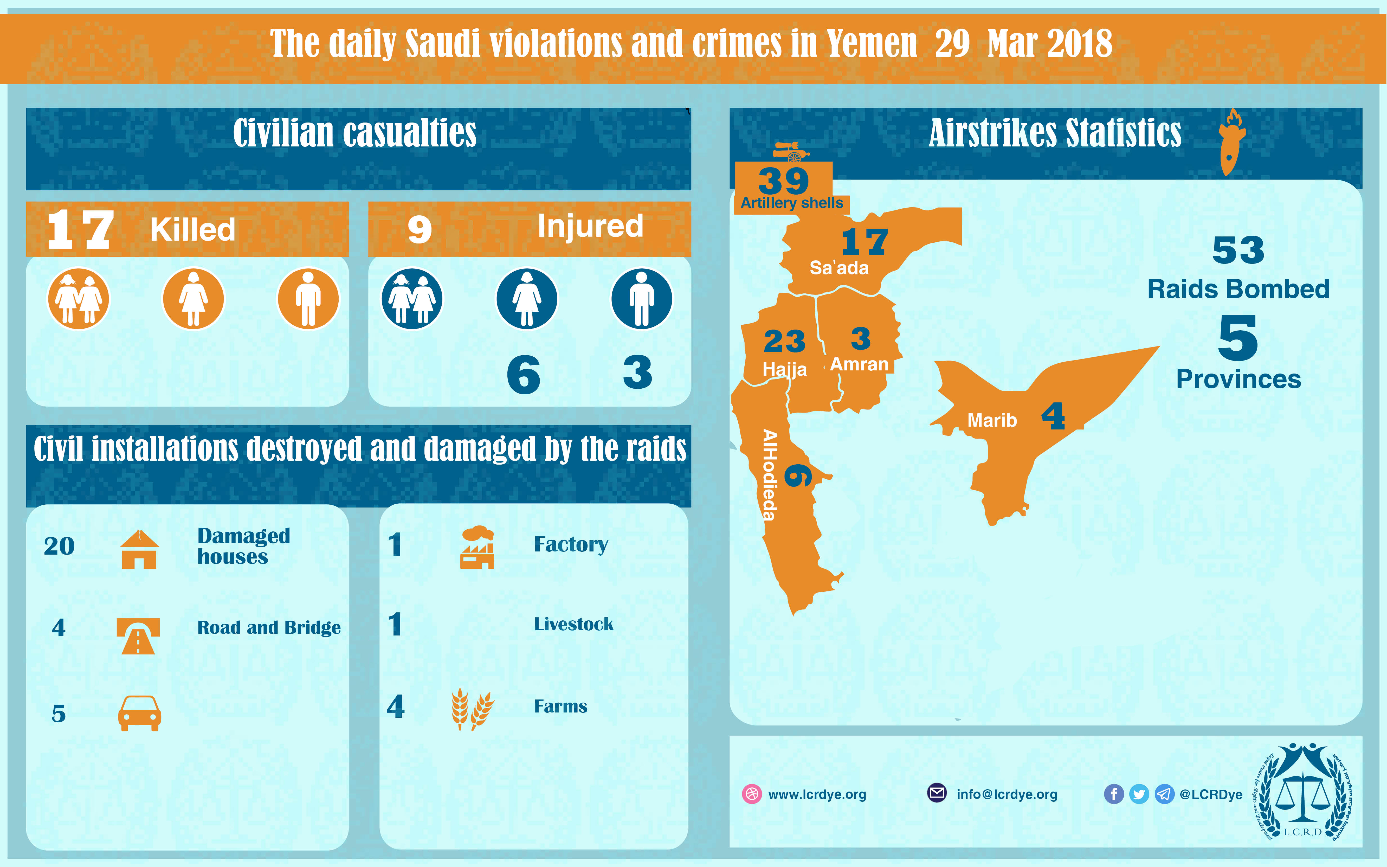 The Daily Violation and Crimes observation Report that are committed by the Saudi Arabia and its collation in 29_3_2018 Share For download https://www.lcrdye.org/wp-content/uploads/2018/03/29-Mar-2018.pdf legal center for right and developmentSaudi coalition CrimesViolation war lawsYemen Share FacebookTwitterGoogle+ReddItWhatsAppPinterestEmail