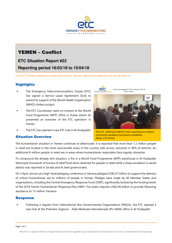 YEMEN – Conflict ETC Situation Report #22 Reporting period 16/03/18 to 15/04/18