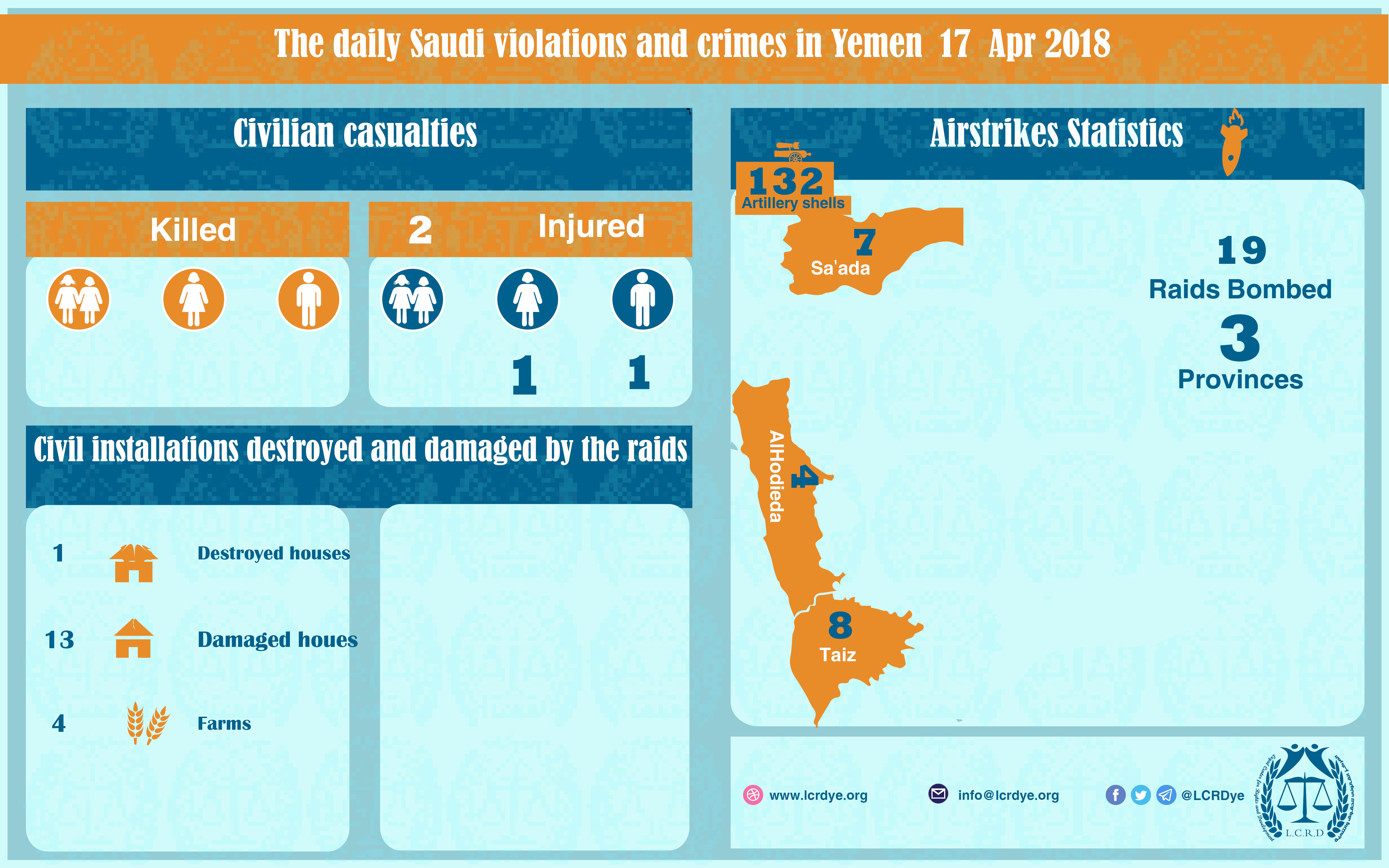 The Daily Violation and Crimes observation Report that are committed by the Saudi Arabia and its collation in 17-4-2018 Share For download https://www.lcrdye.org/wp-content/uploads/2018/04/17-Apr-2018-2.pdf legal center for right and developmentSaudi coalition CrimesViolation war lawsYemen Share FacebookTwitterGoogle+ReddItWhatsAppPinterestEmail